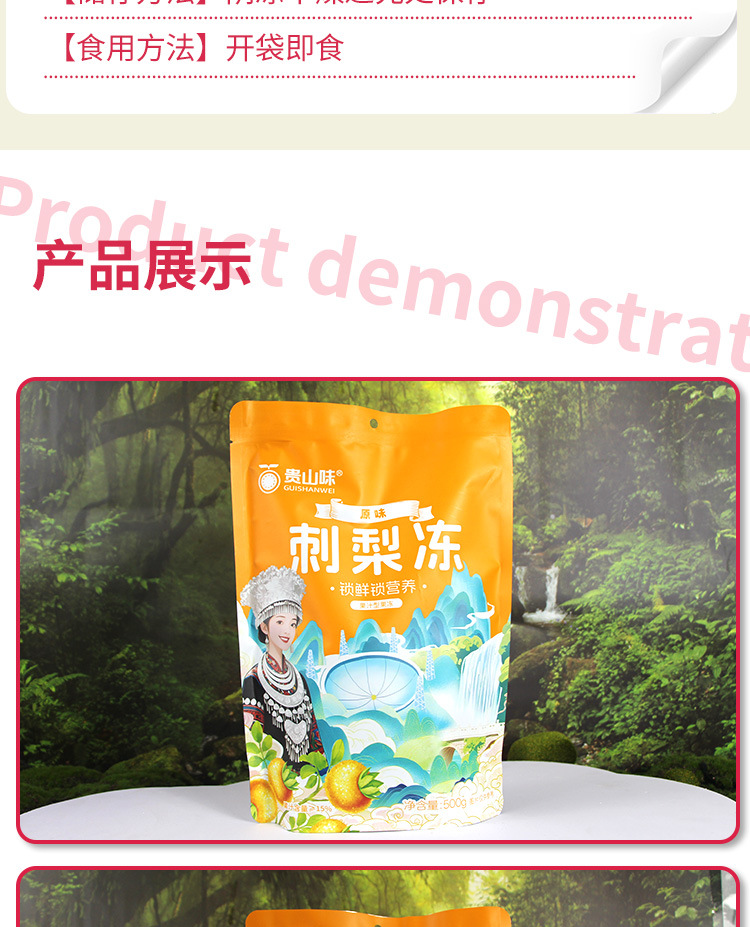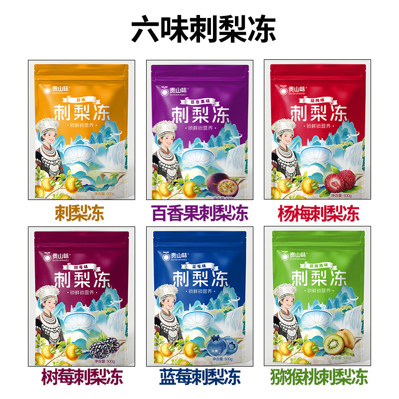 包装规格 500克原味刺梨冻*1袋,500克杨梅味刺梨冻*1袋,500克百香果味刺梨冻*1袋,500克猕猴桃味刺梨冻*1袋,500克蓝莓味刺梨冻*1袋,500克树莓味刺梨冻*1袋,原味杨梅百香果猕猴桃树莓蓝莓各一袋*共6袋