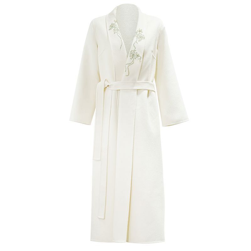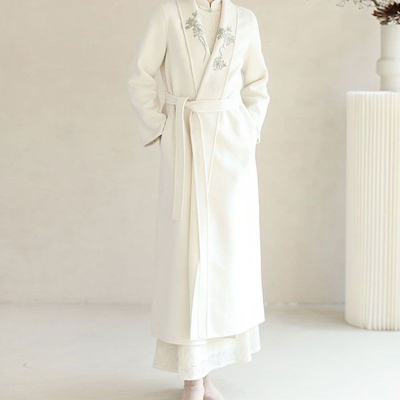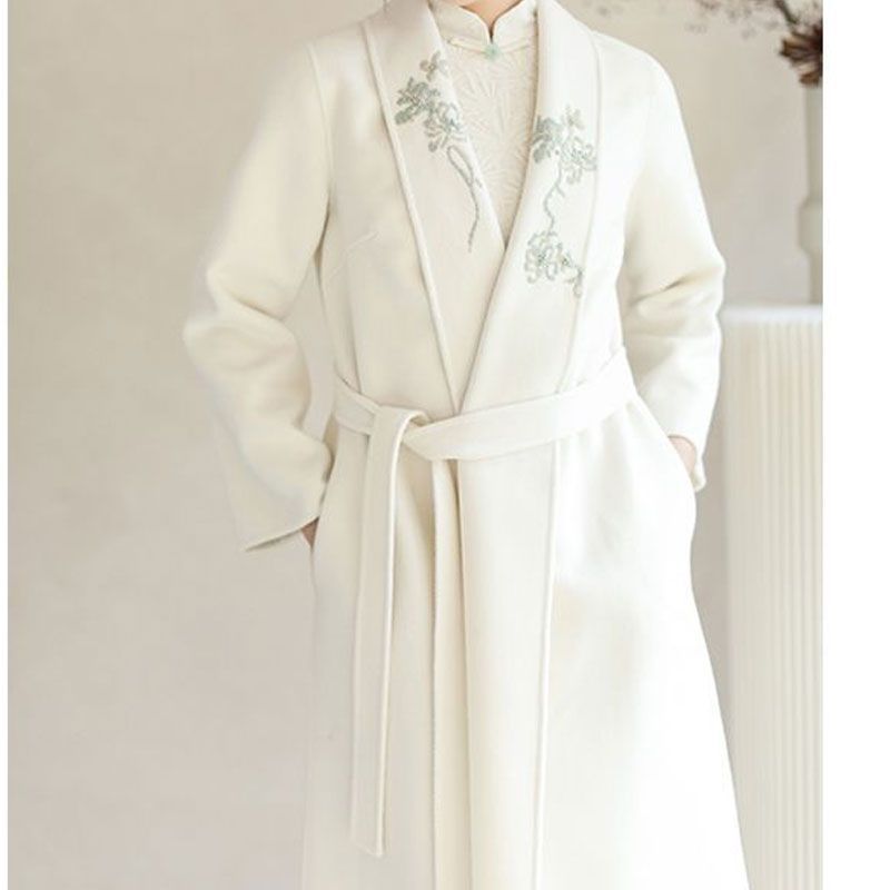 2025秋季款文艺中国风复古毛呢改良长袖V领系带日常可穿白色外套