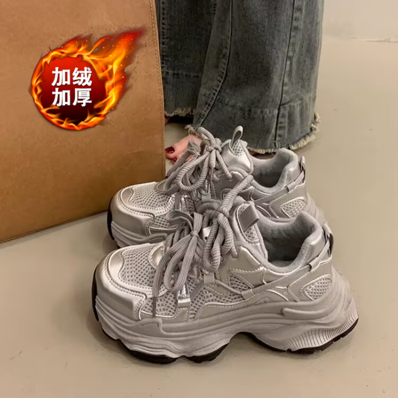 加绒爆款松糕厚底老爹鞋女小个子增高2025新款网面透气休闲运动鞋
