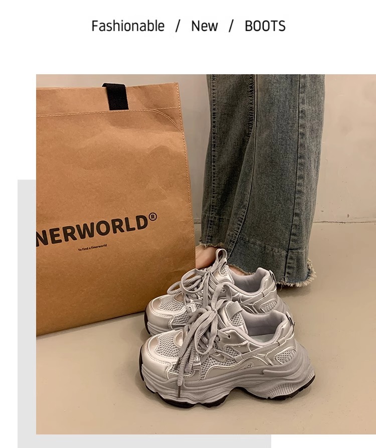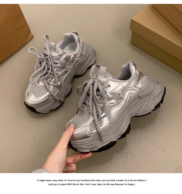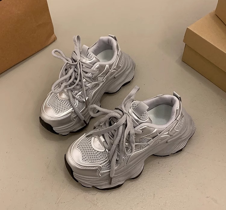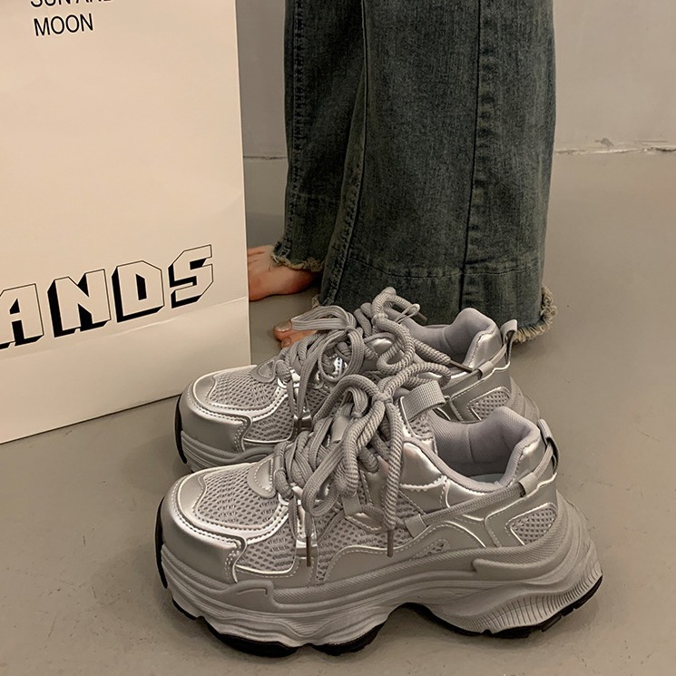 女性靴の厚い底のネットの通気性の銀色のお父さんの靴の2025夏の新型のファッションは高くなって、カジュアルな運動靴に合わせます。