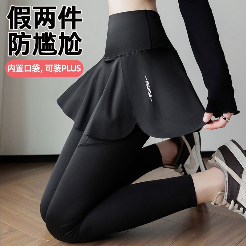 源头带口袋瑜伽裙裤假两件防走光高腰收腹显瘦健身运动打底鲨代发