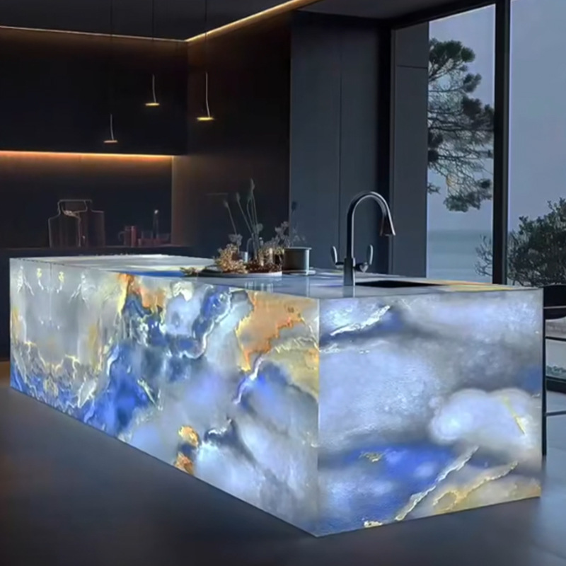厂家天然大理石蓝玉奢石发光石材岛台餐桌背景墙楼梯别墅洗手台面