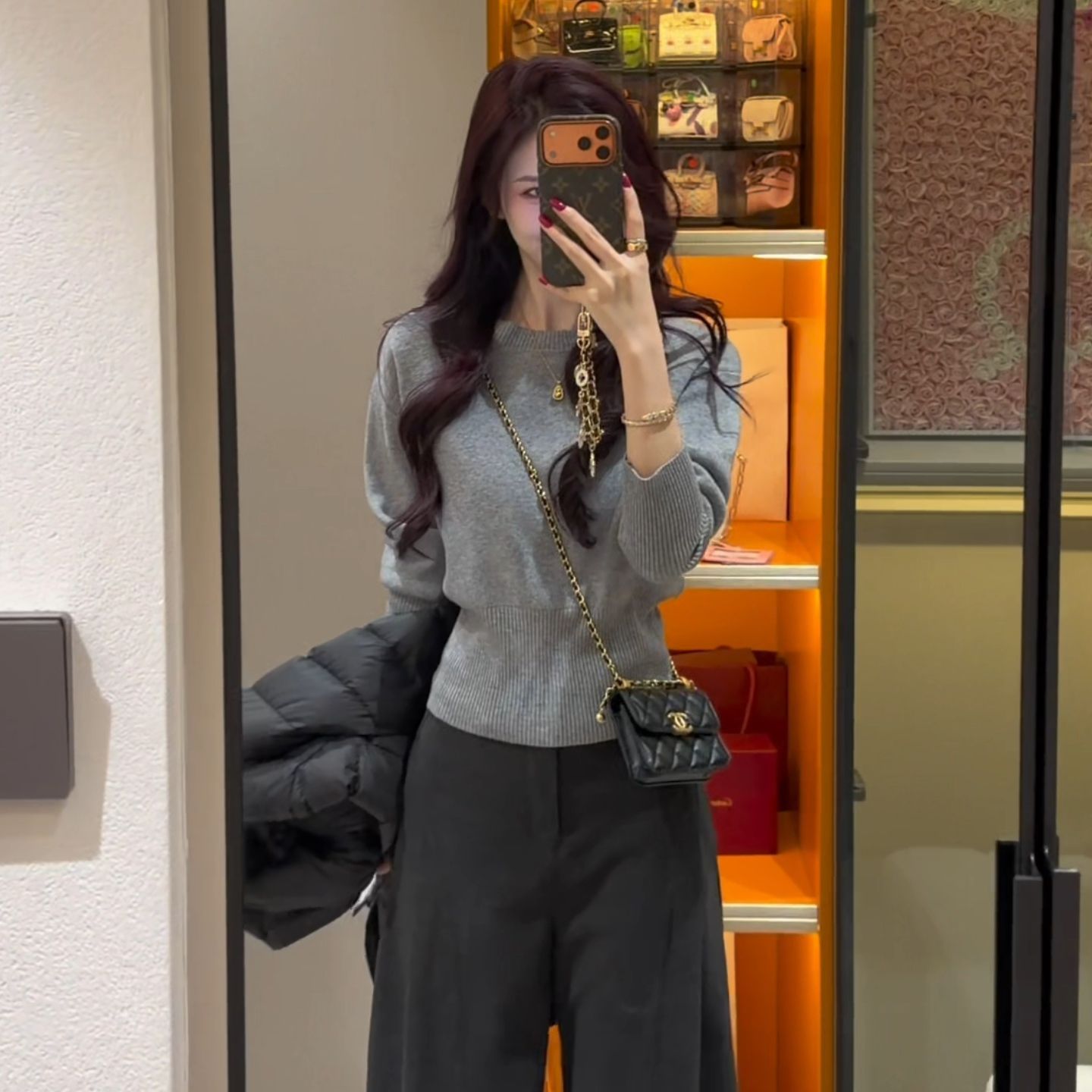 深灰正肩V领长袖针织衫女2025秋冬季新款收腰显瘦内搭打底衫上衣