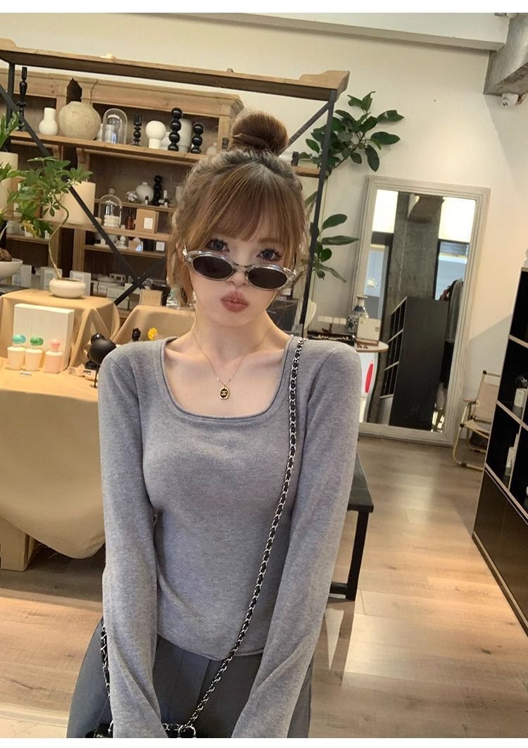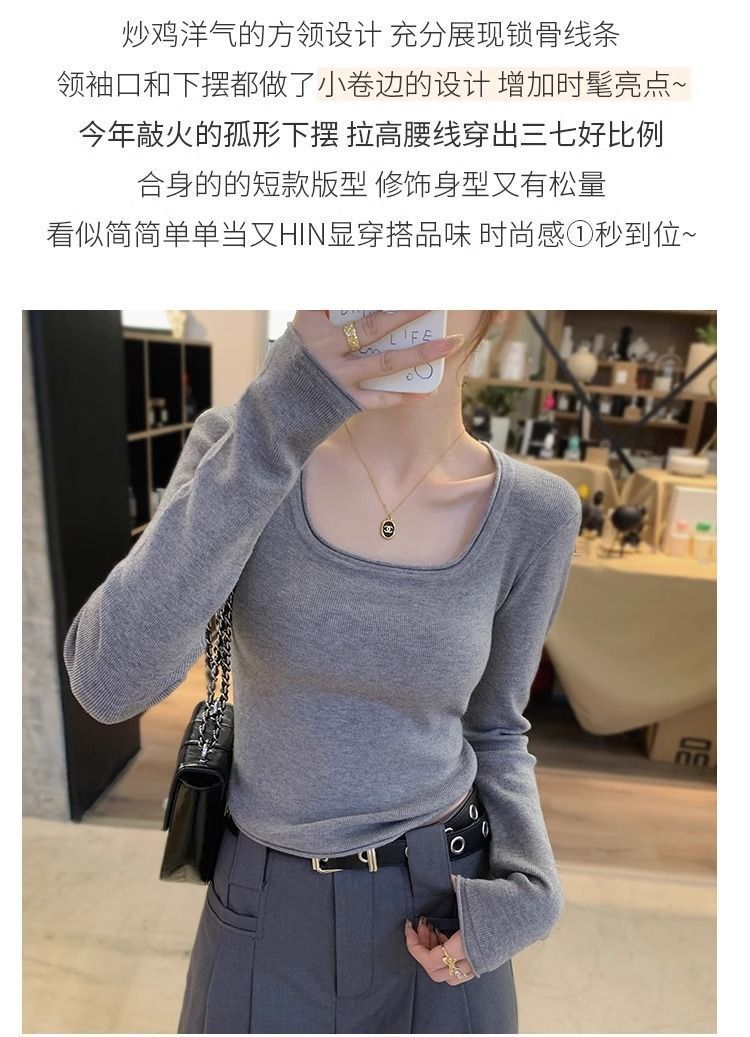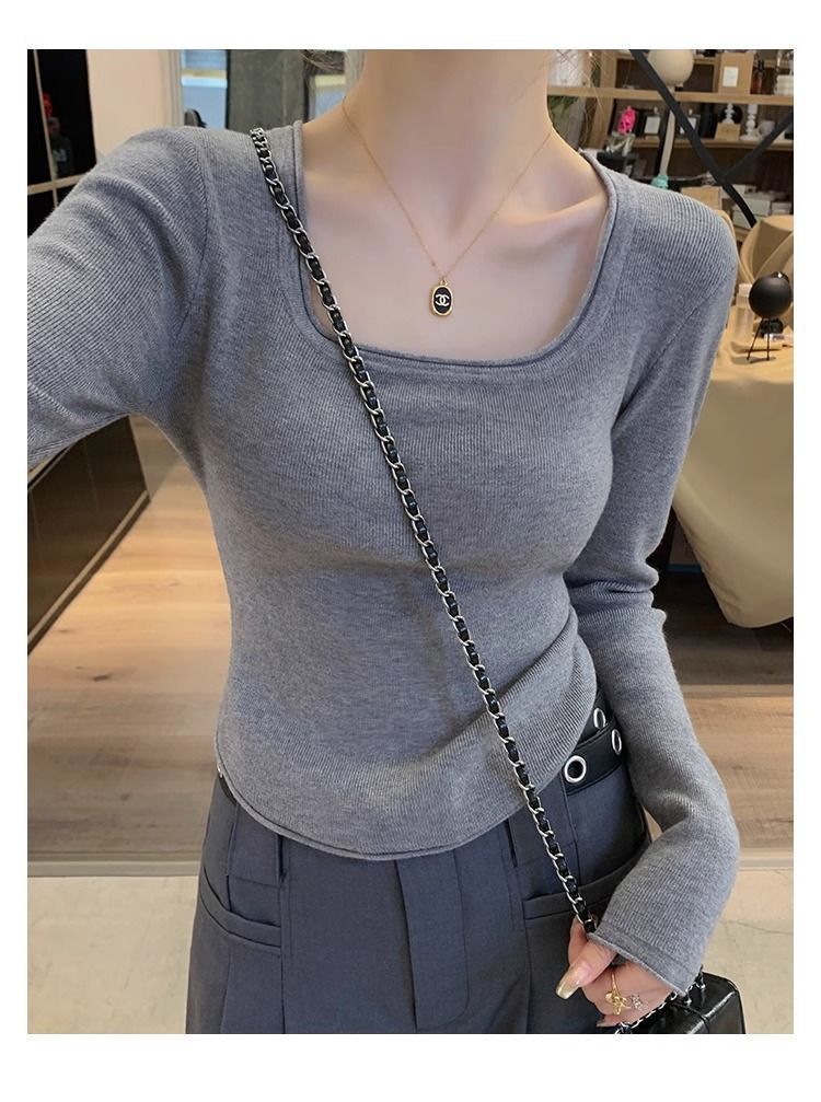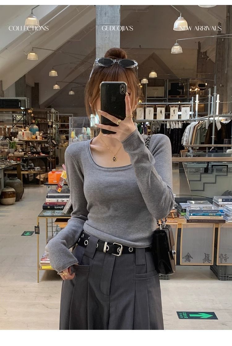 秋冬季灰色内搭打底衫女生设计感小众修身显瘦辣妹方领针织衫上衣