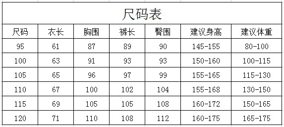 尺码 M 建议80-100斤,L 建议100-115斤,XL 建议115-130斤,2XL 建议130-145斤,3XL 建议145-160斤,4XL 建议160-175斤