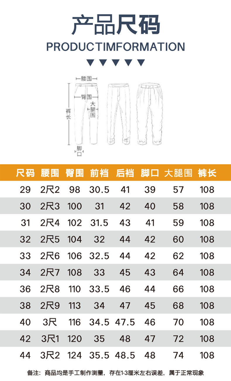 尺码 29(2尺2),30(2尺3),31(2尺4),32(2尺5),33(2尺6),34(2尺7),36(2尺8),38(2尺9),40(3尺),42(3尺1),44(3尺2)