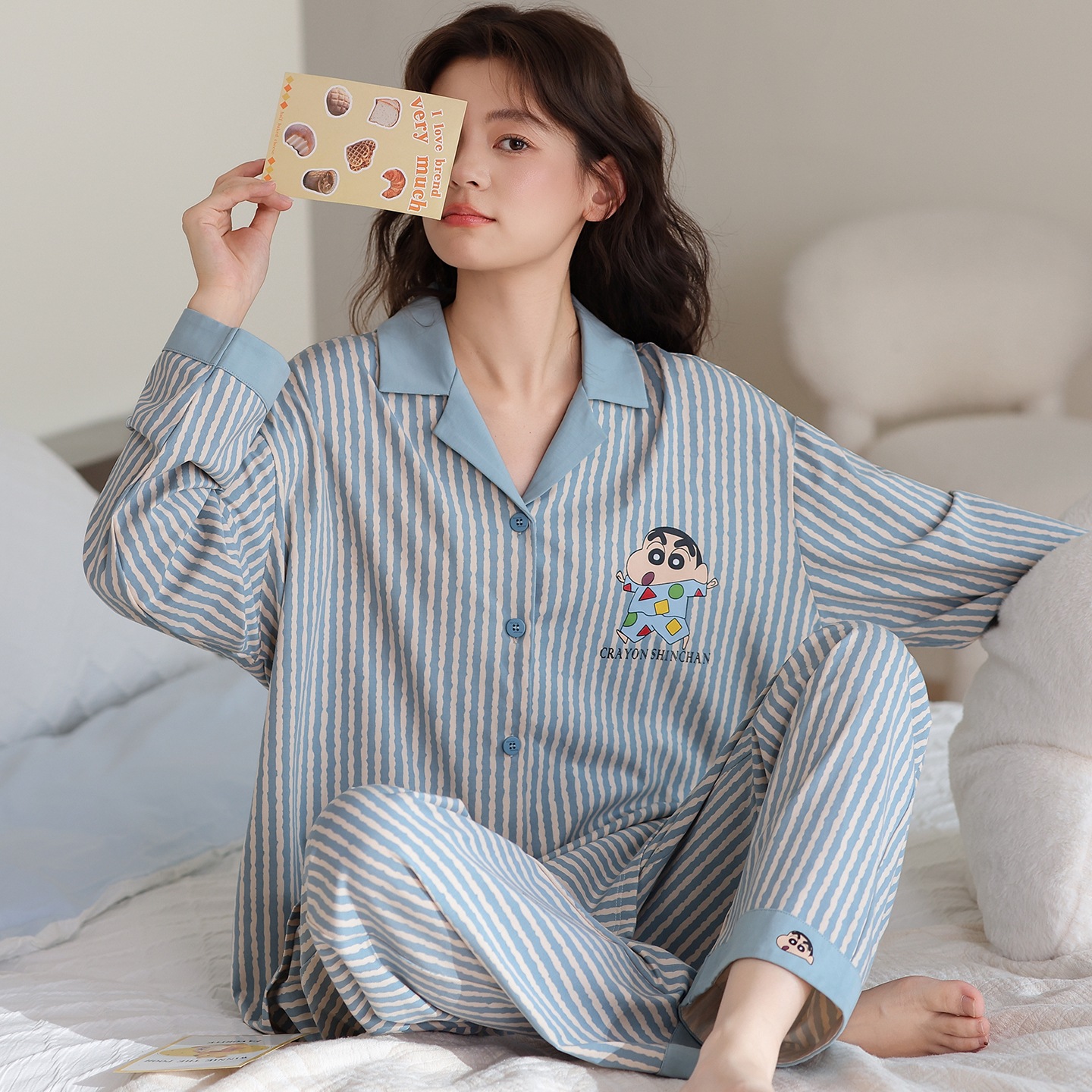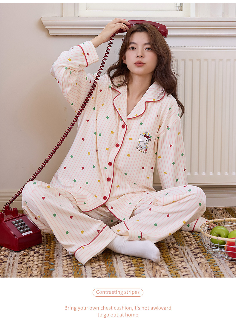 100%纯棉带胸垫睡衣女生秋冬季长袖开衫女士卡通可外穿全棉家居服