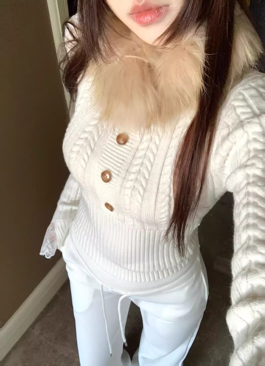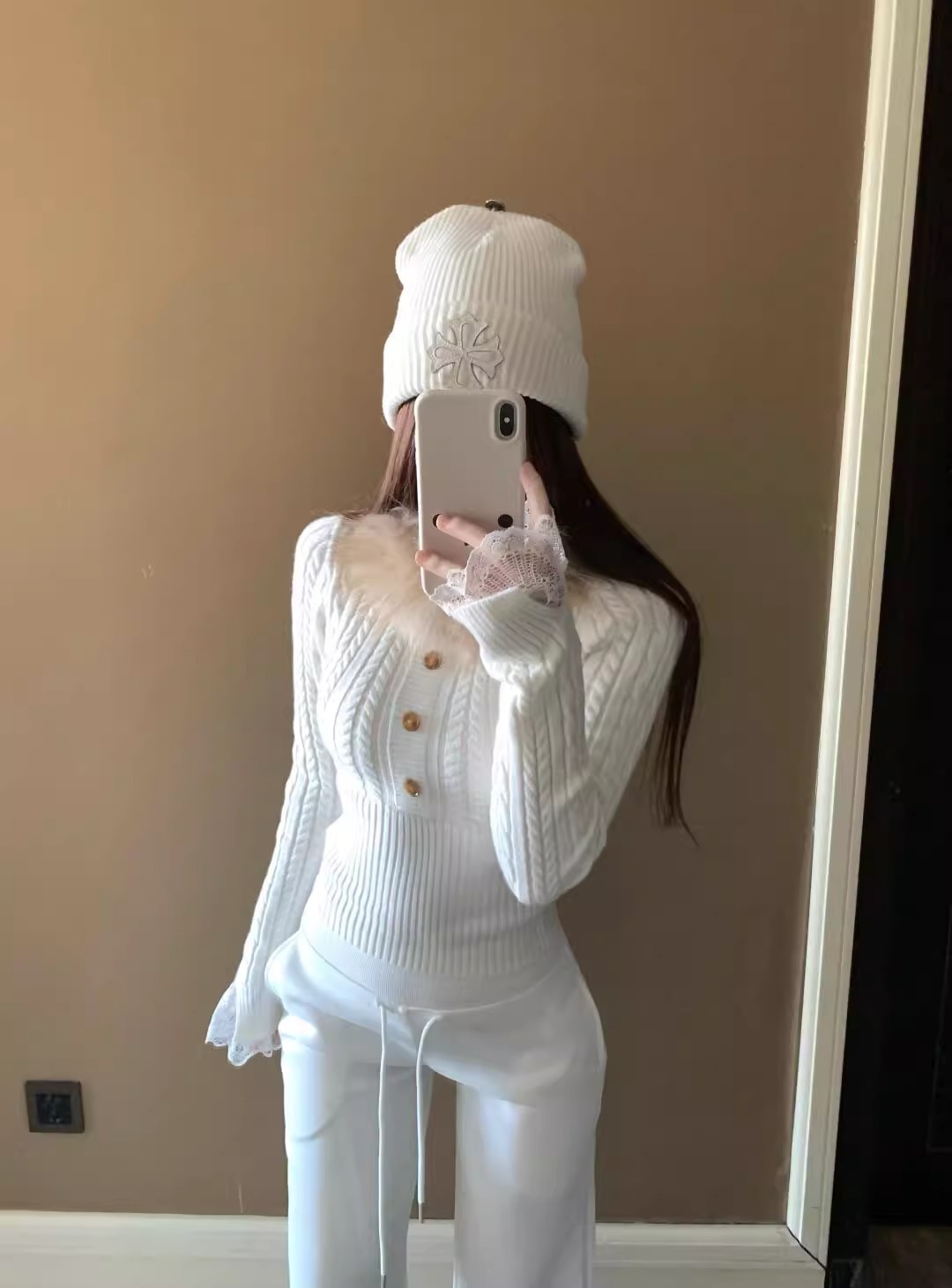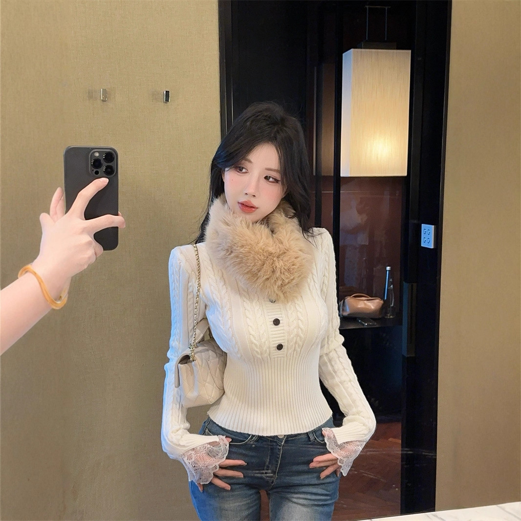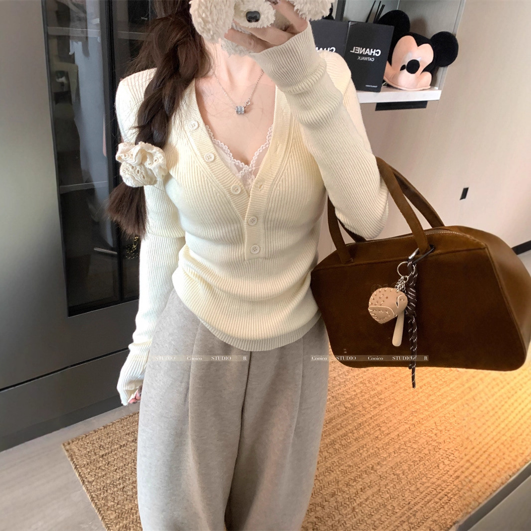 V领长袖针织衫秋冬甜辣内搭修身初冬白色打底修身上衣女装