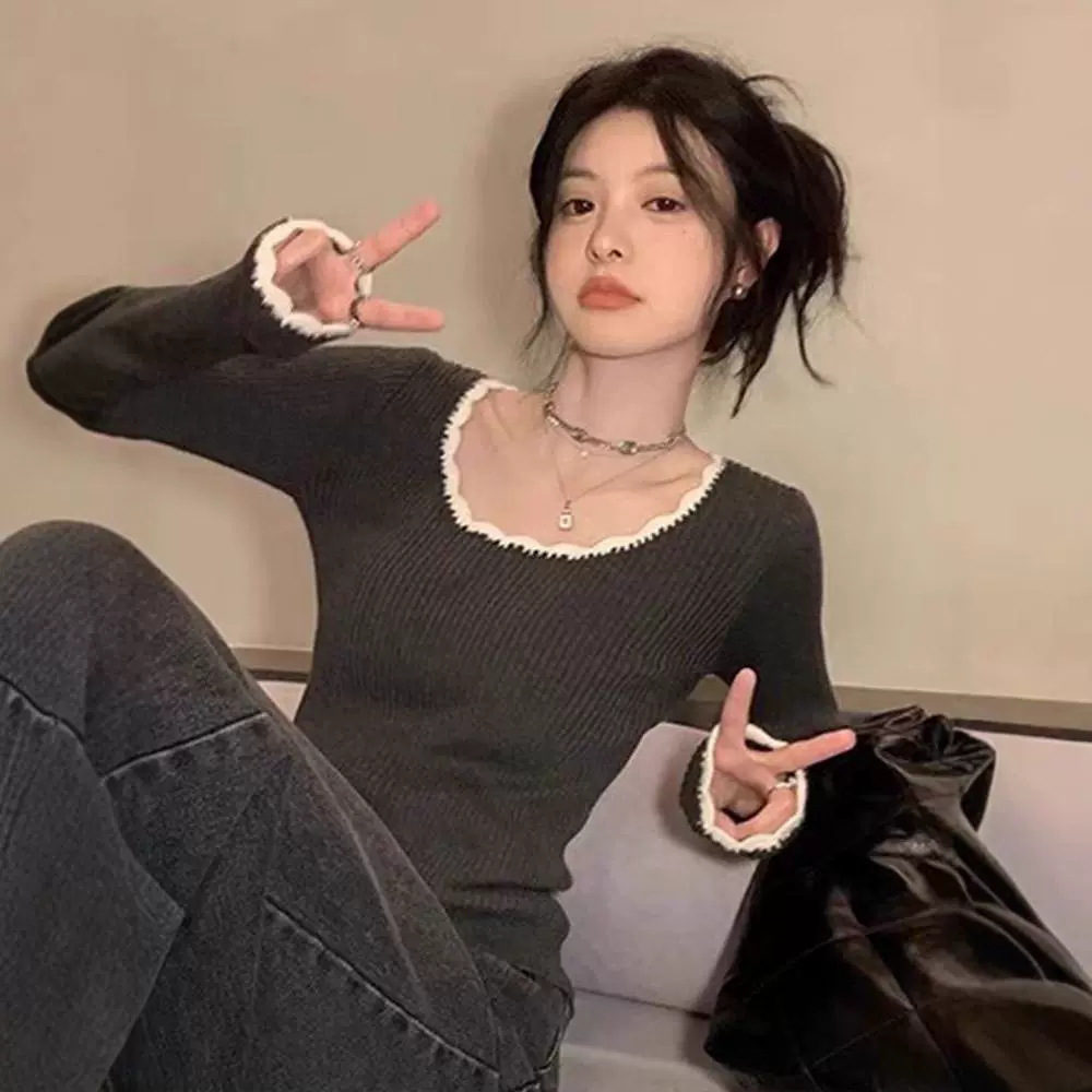 灰色针织打底衫女秋冬内搭毛衣设计感长袖上衣