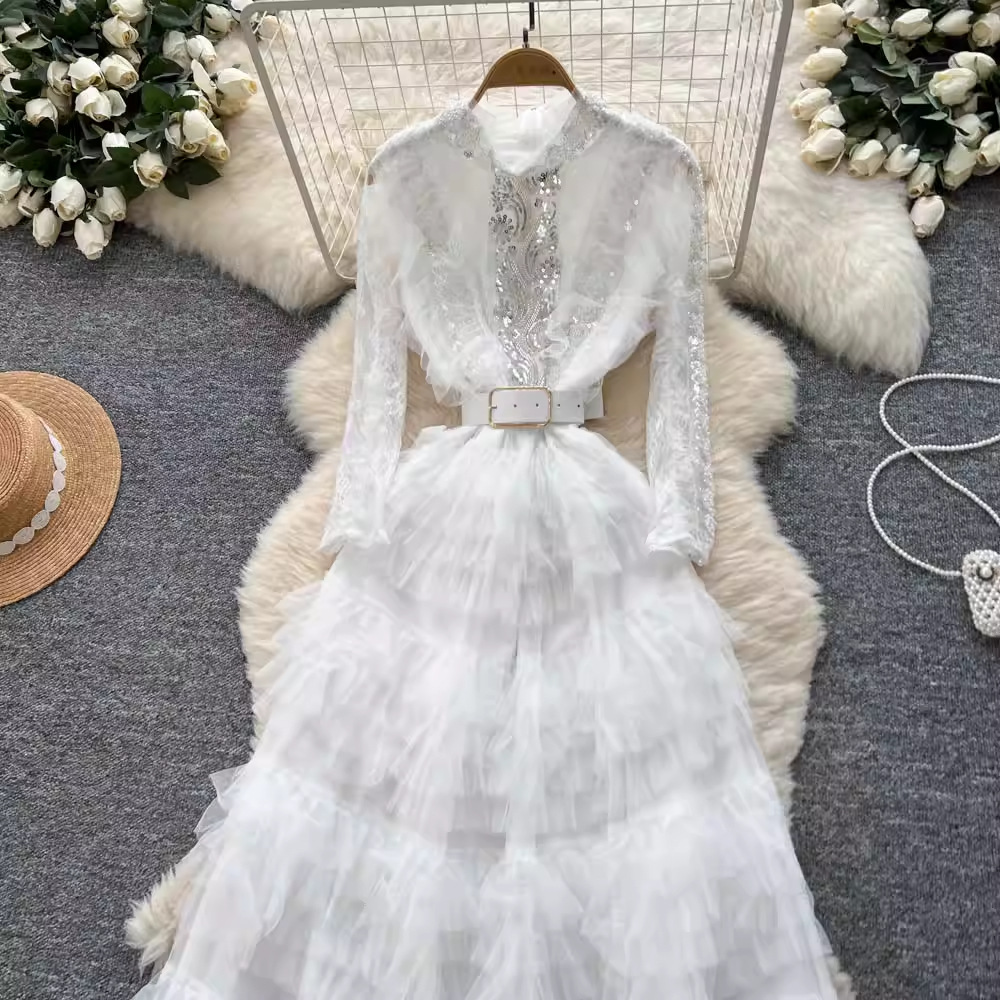 法式轻奢名媛重工亮片绣珠收腰网纱蓬蓬连衣裙女显瘦气质优雅长裙
