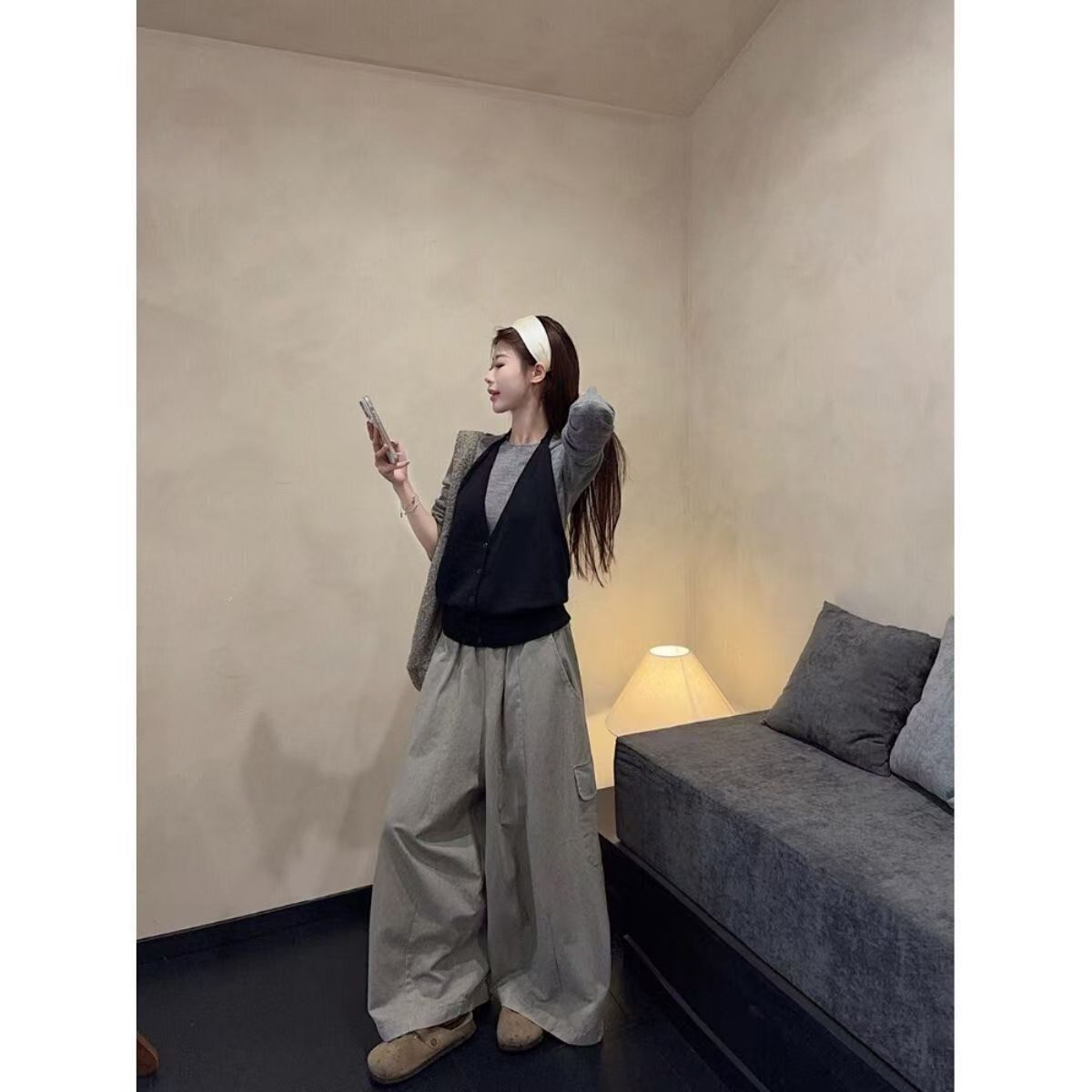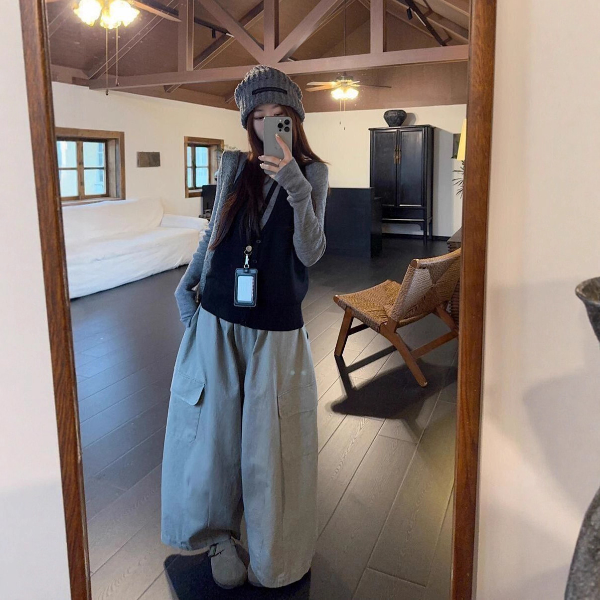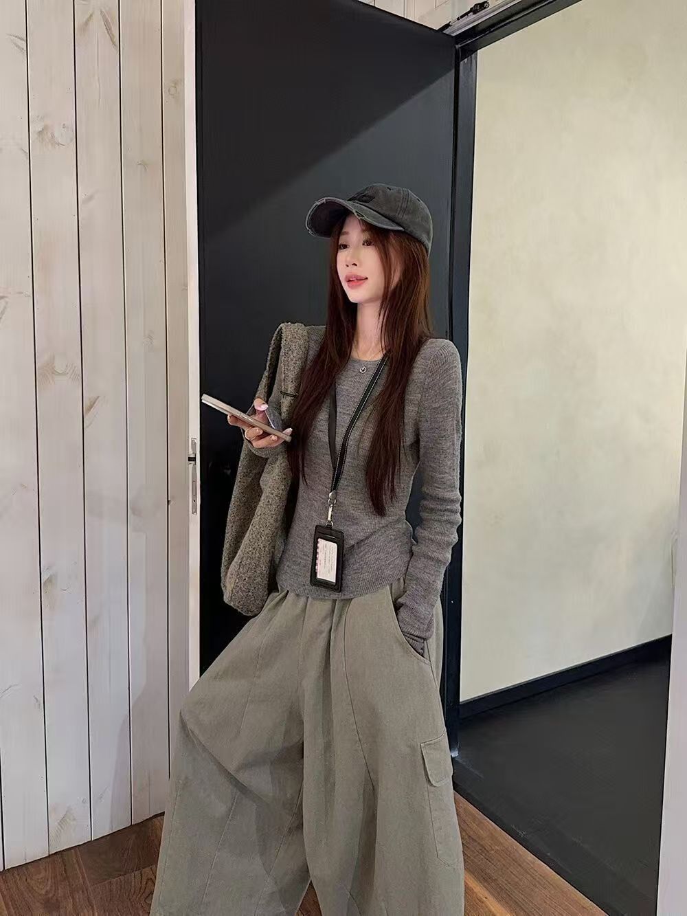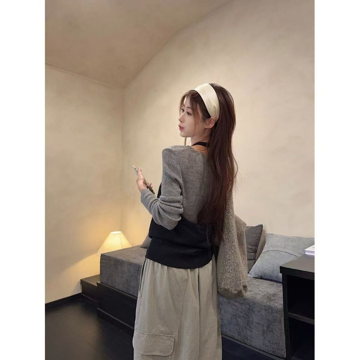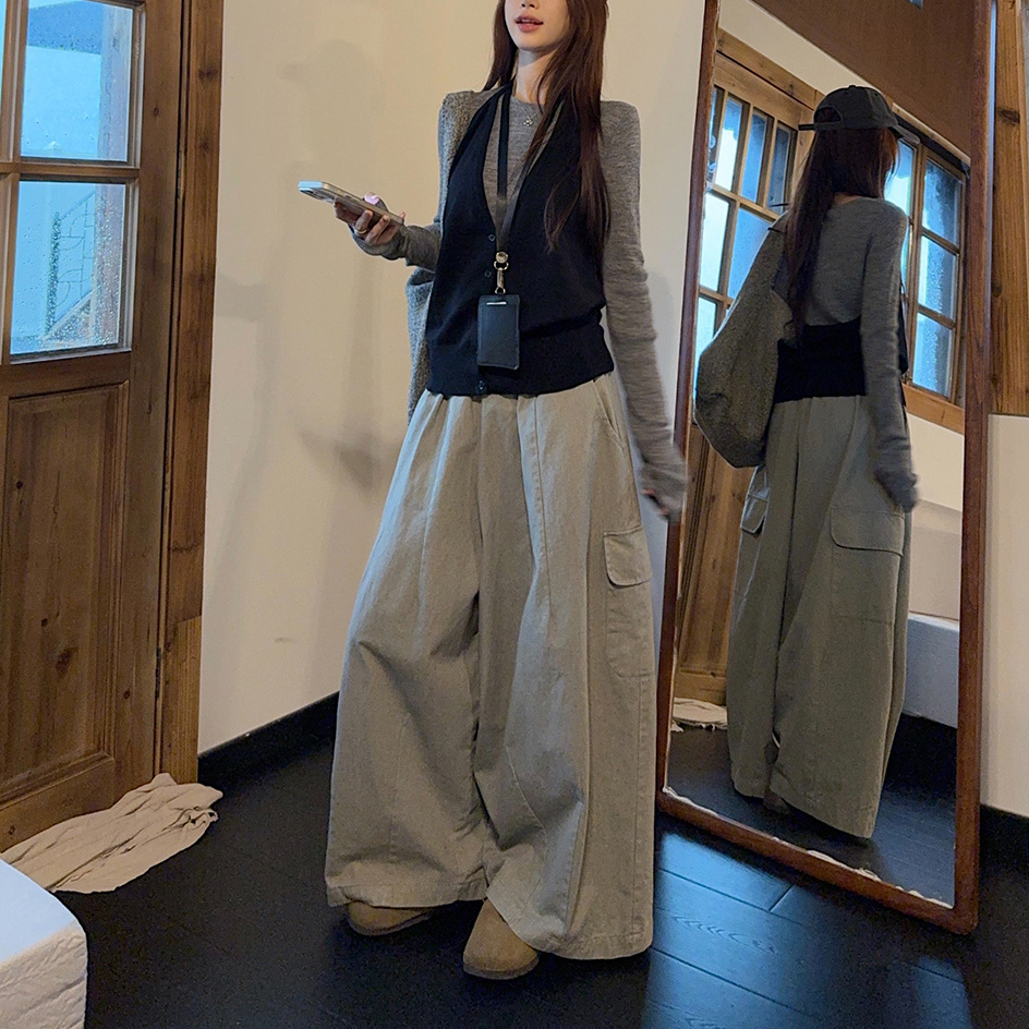 实拍 2025韩系穿搭一整套灰色针织衫+挂脖吊带+水洗工装休闲裤女