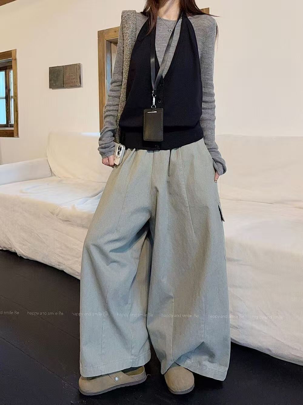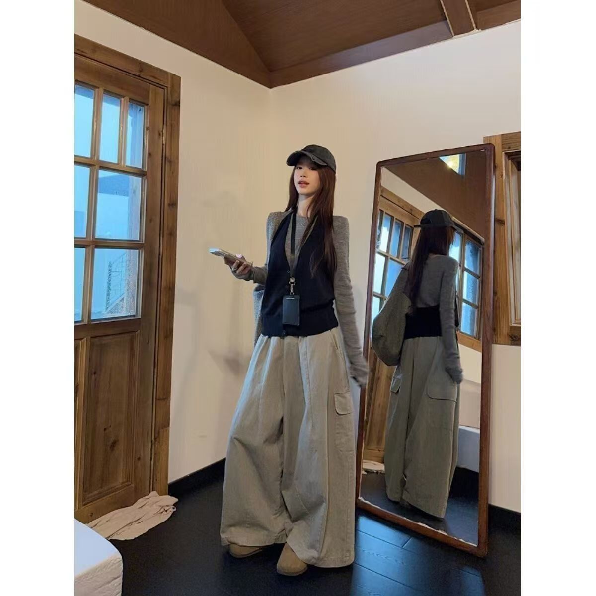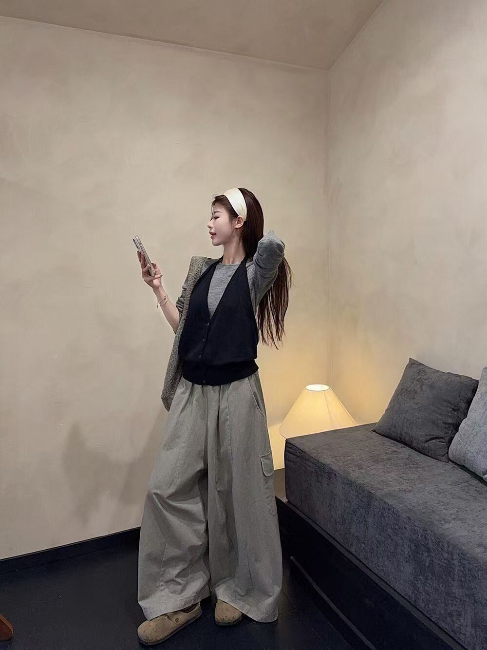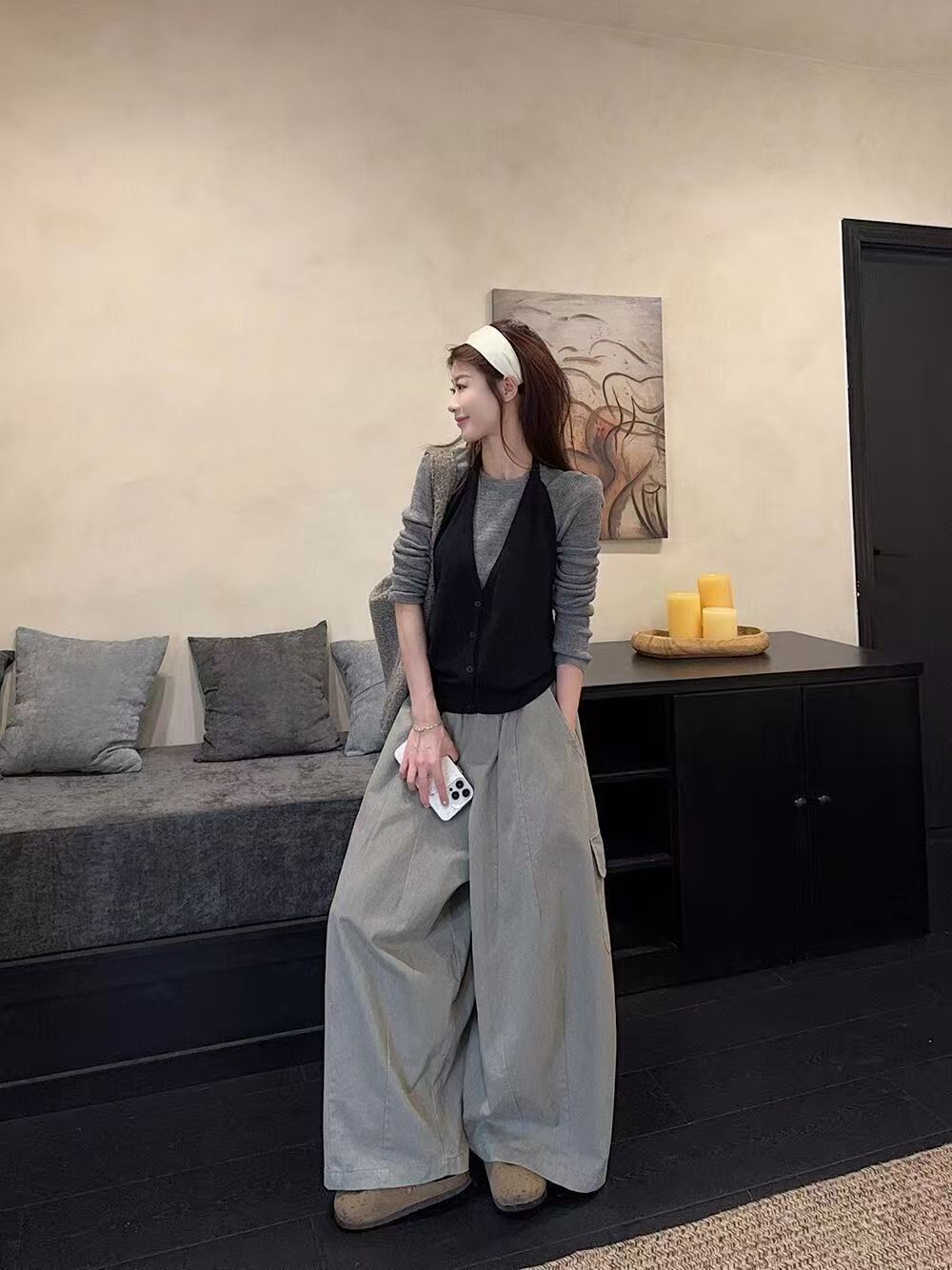 实拍 2025韩系穿搭一整套灰色针织衫+挂脖吊带+水洗工装休闲裤女