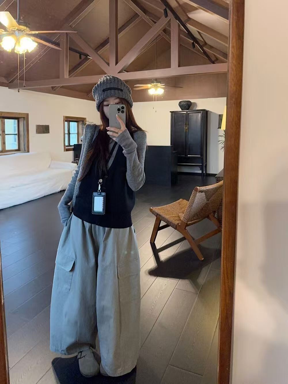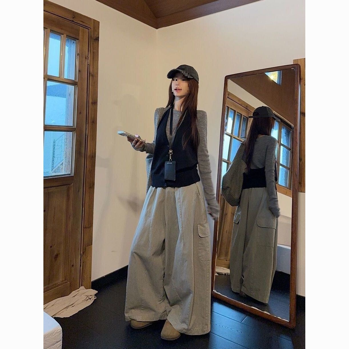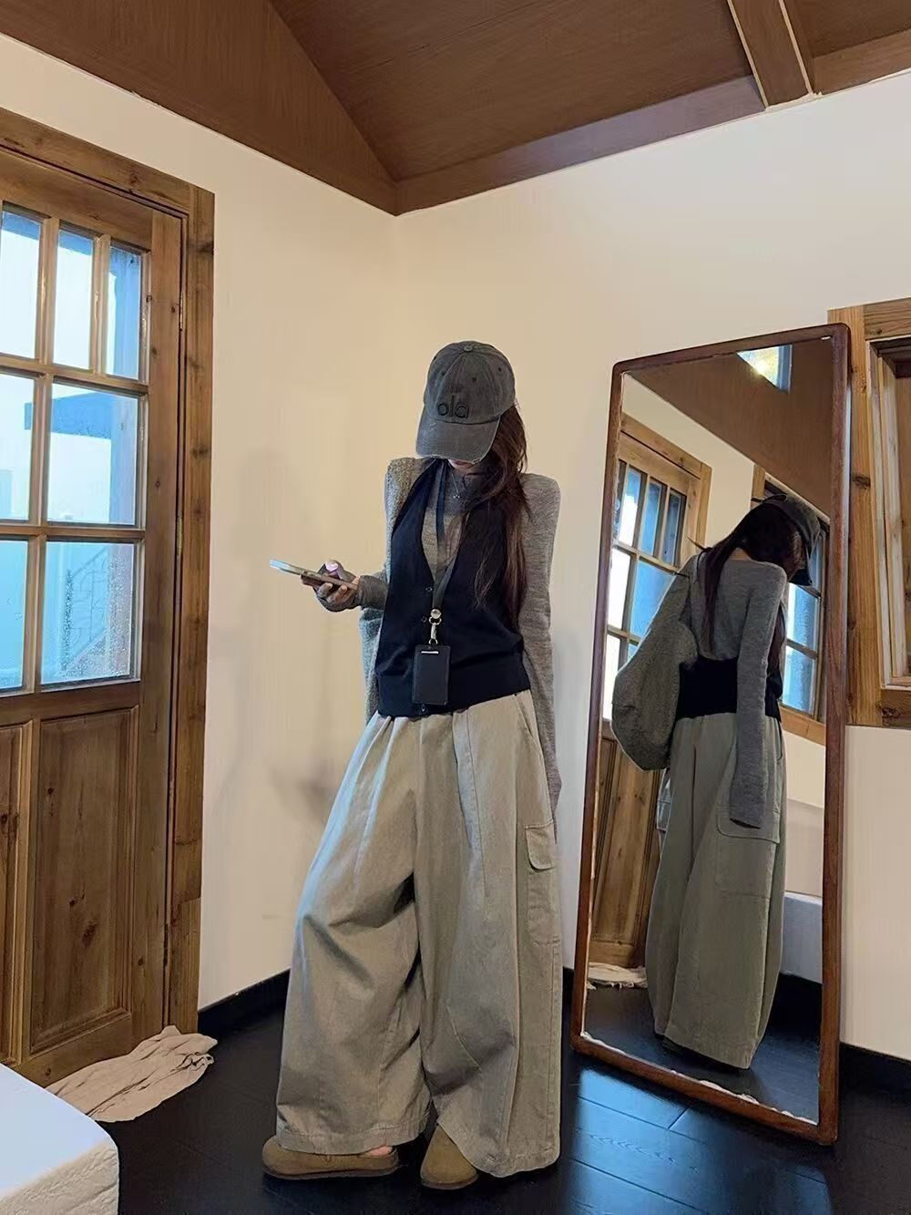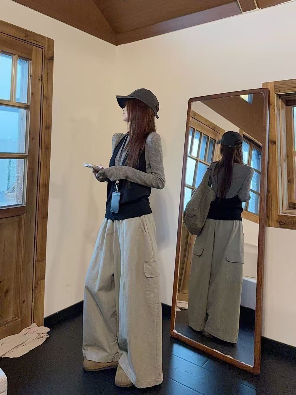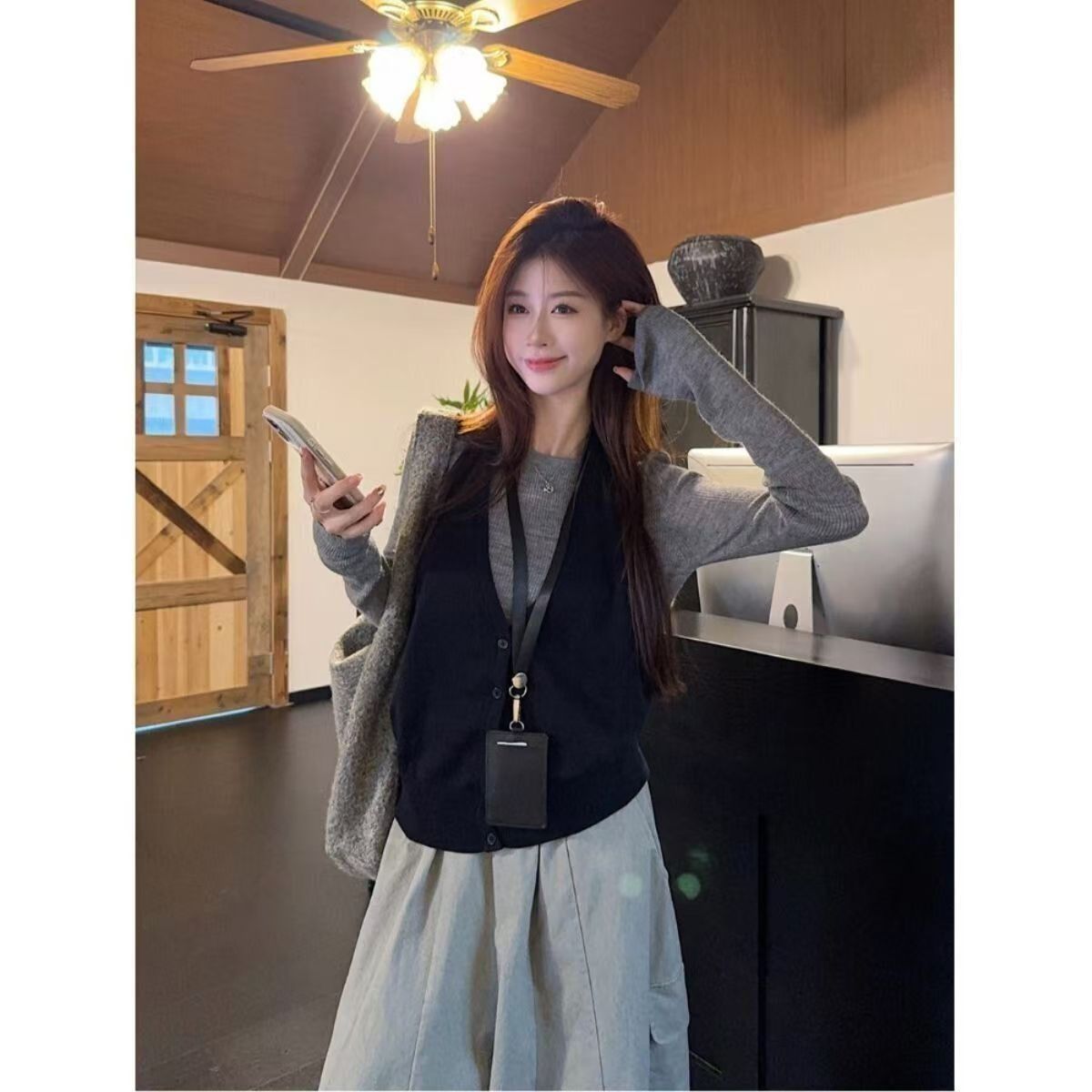 实拍 2025韩系穿搭一整套灰色针织衫+挂脖吊带+水洗工装休闲裤女