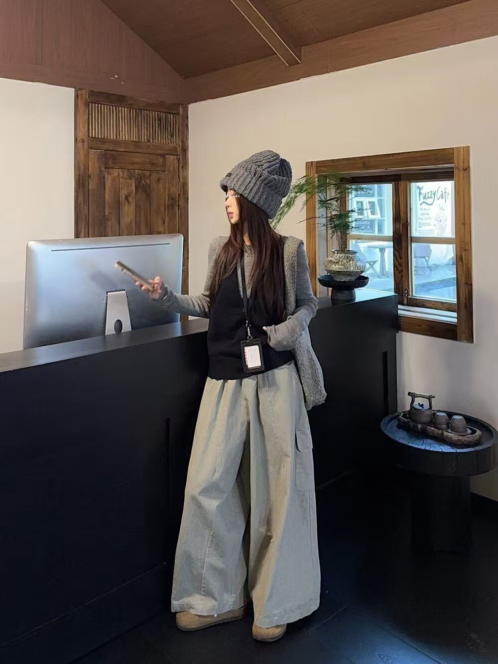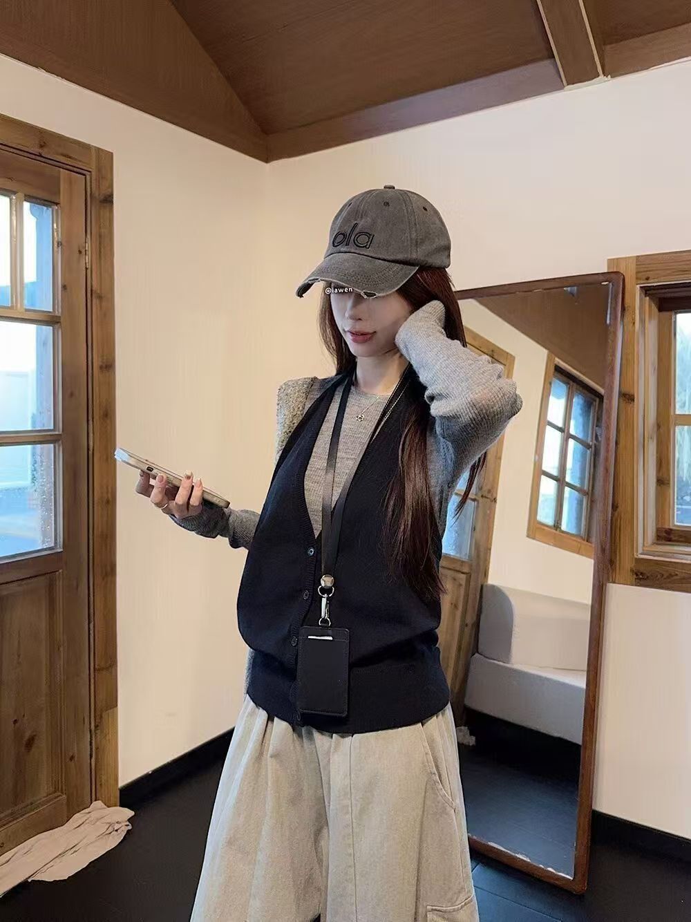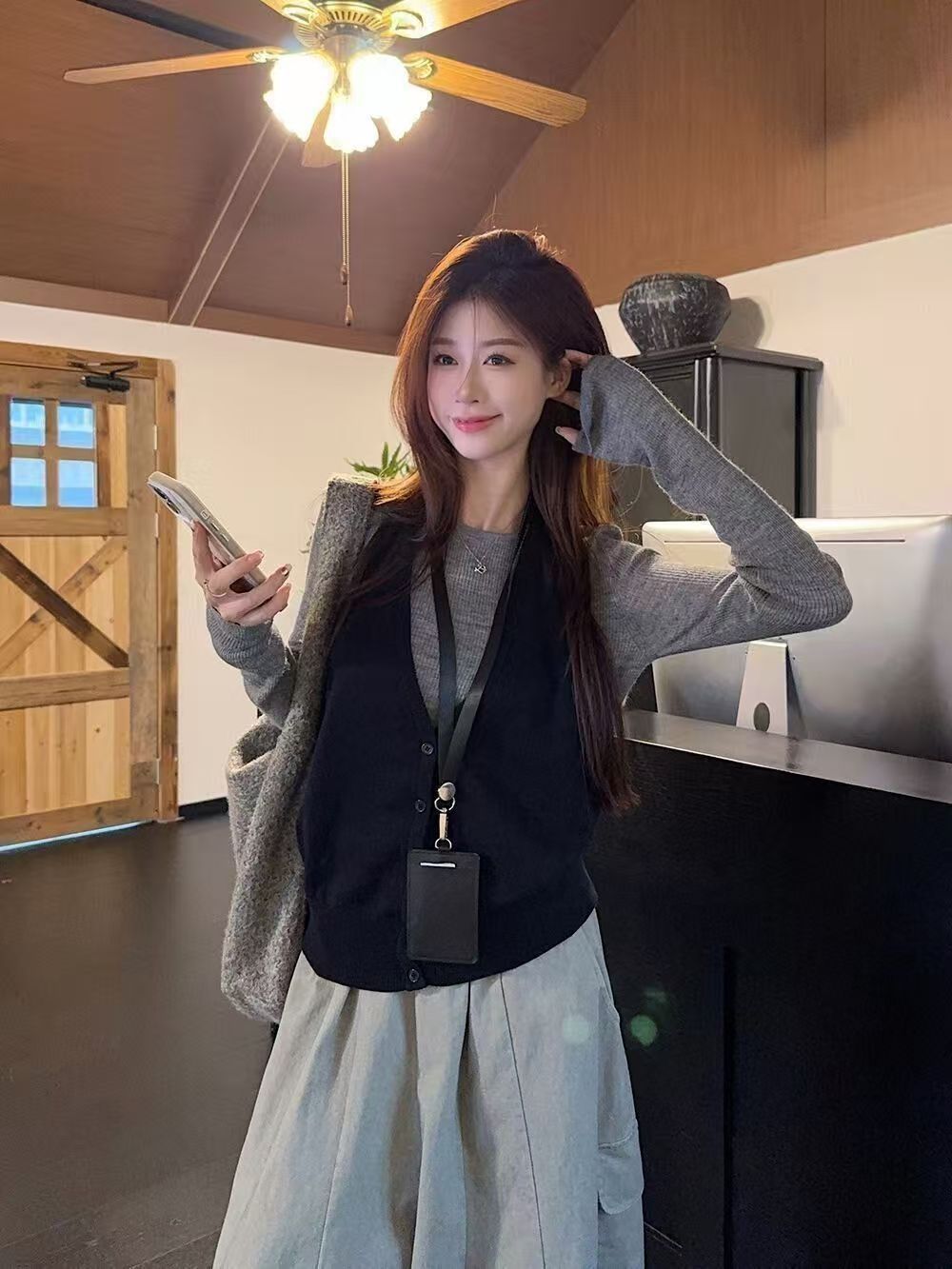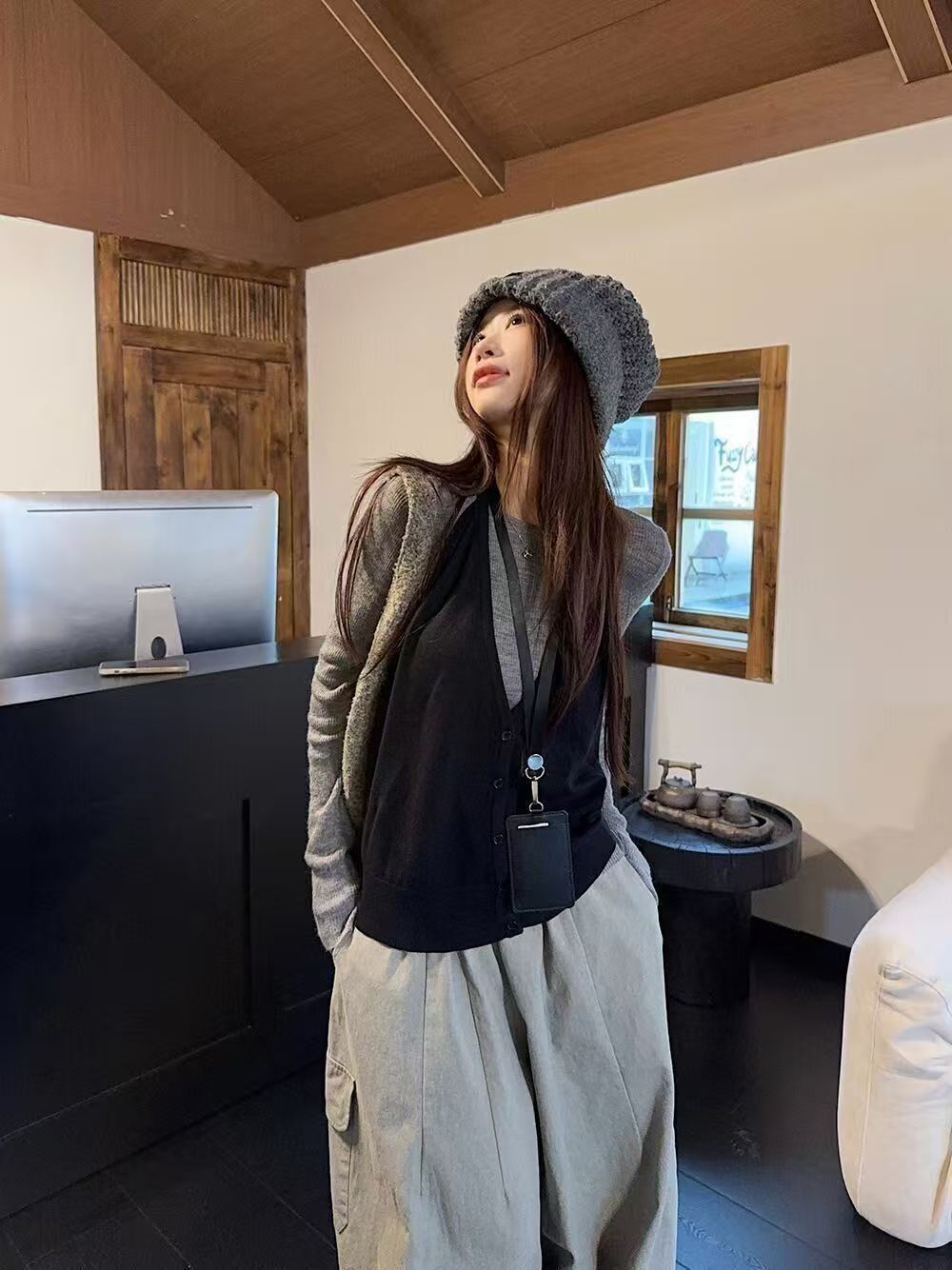 实拍 2025韩系穿搭一整套灰色针织衫+挂脖吊带+水洗工装休闲裤女