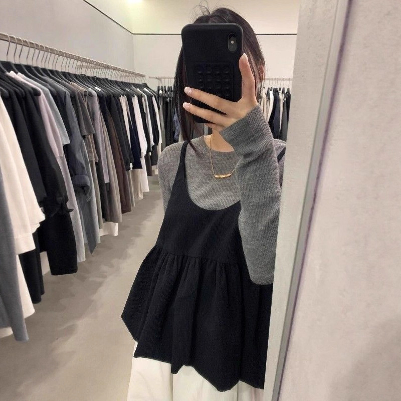 简约通勤风灰色圆领打底长袖上衣女秋冬叠穿黑色花苞吊带两件套装