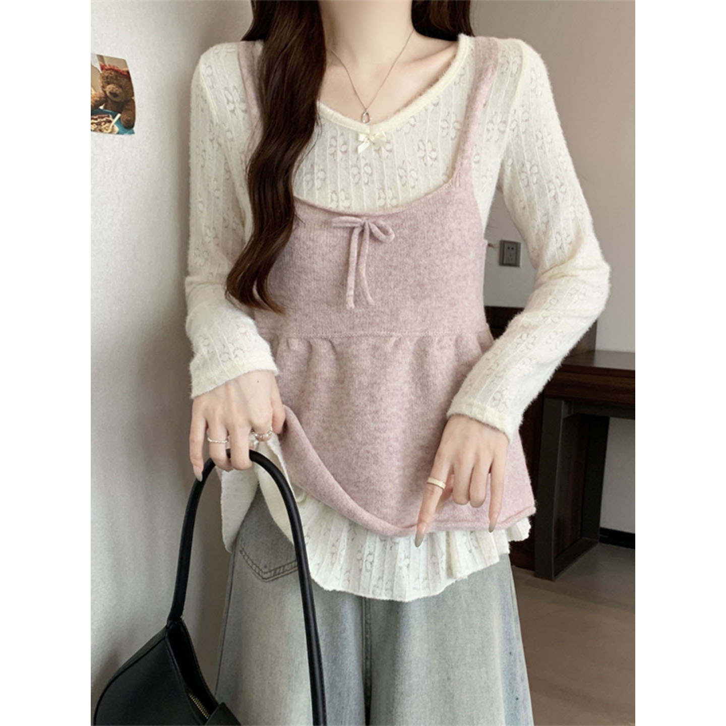 韩系小众设计感镂空长袖打底衫女秋季粉色蝴蝶结针织吊带马甲套装