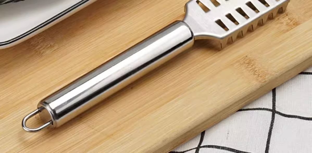 台所のガジェットのステンレスのうろこを削ります。うろこを削ります。うろこを打って魚を殺します。