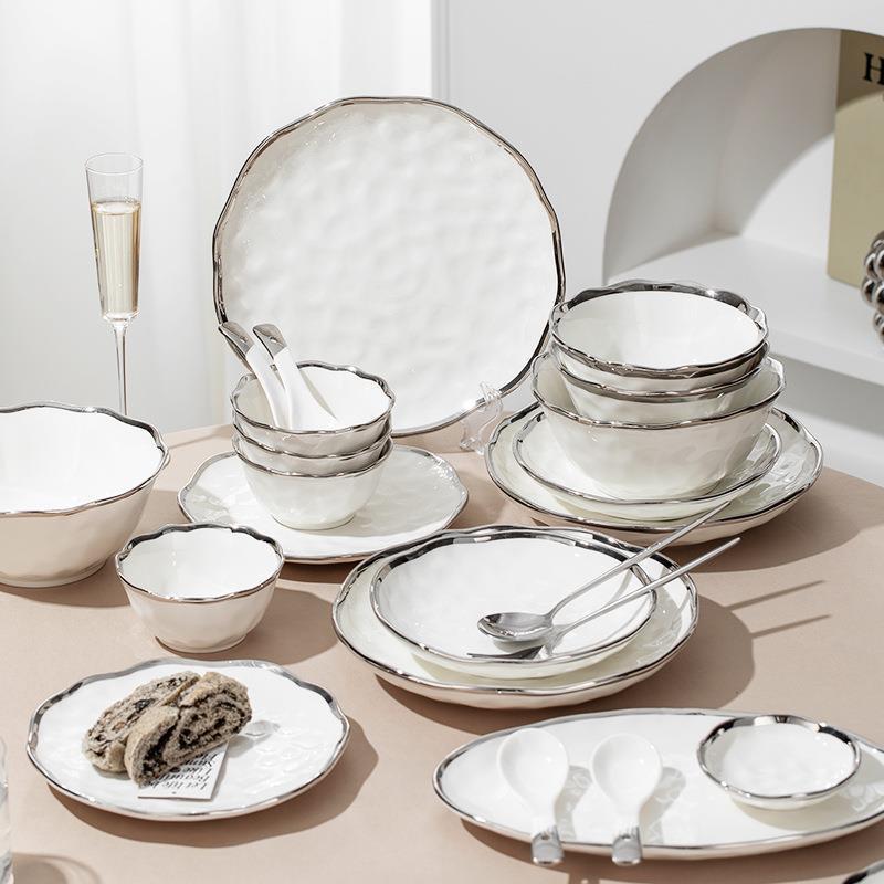 ヨーロッパ式高颜値碗皿セット家庭用皿ins銀辺飯碗高級感麺スープ碗箸陶磁器食器