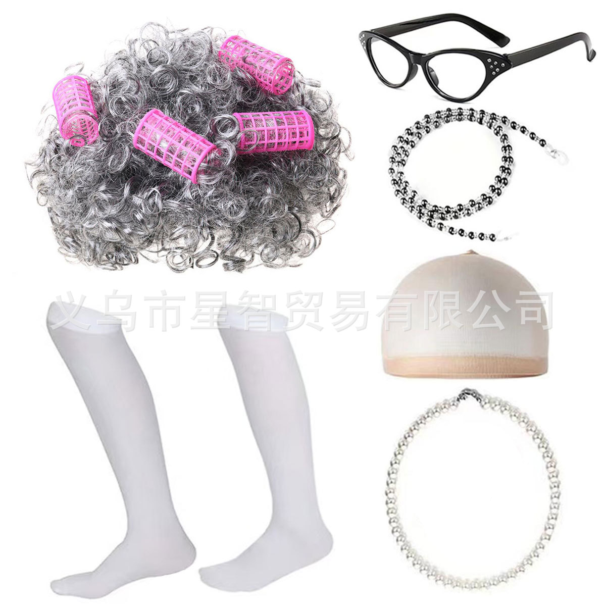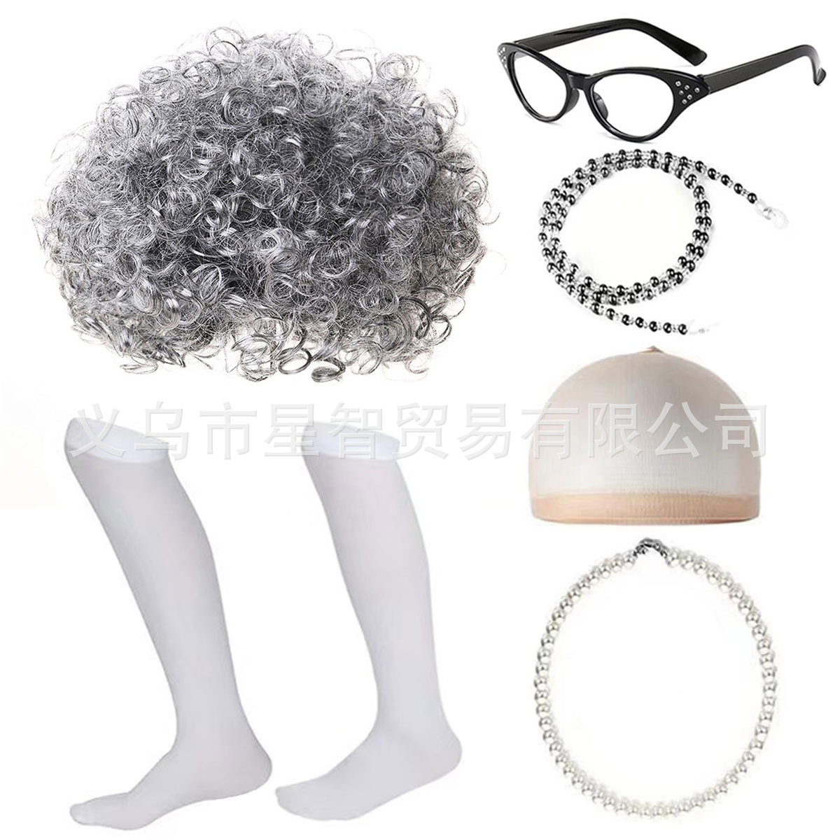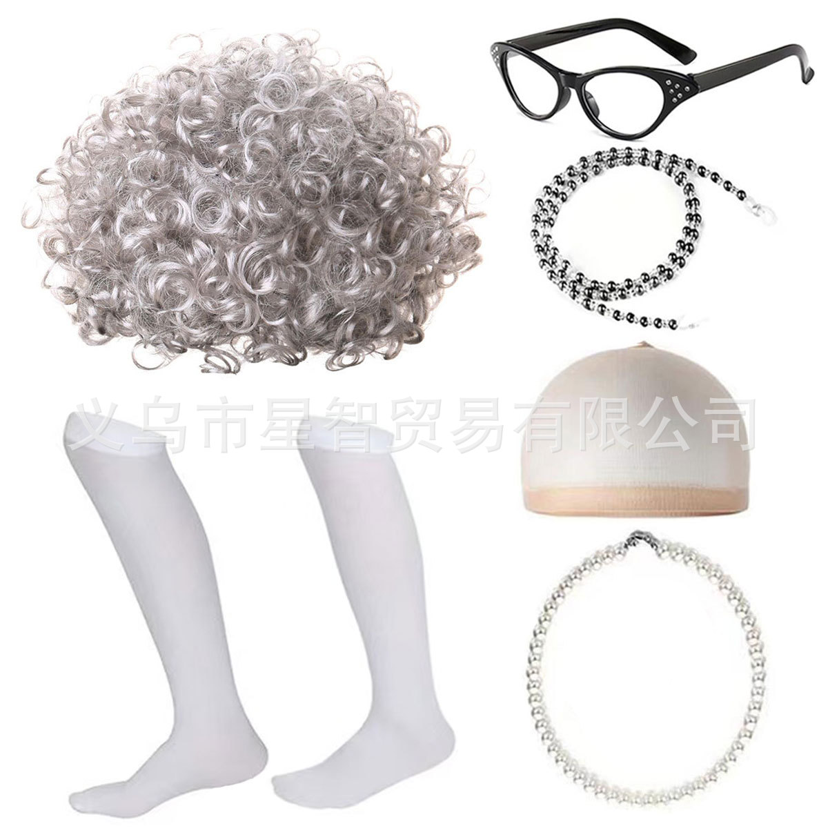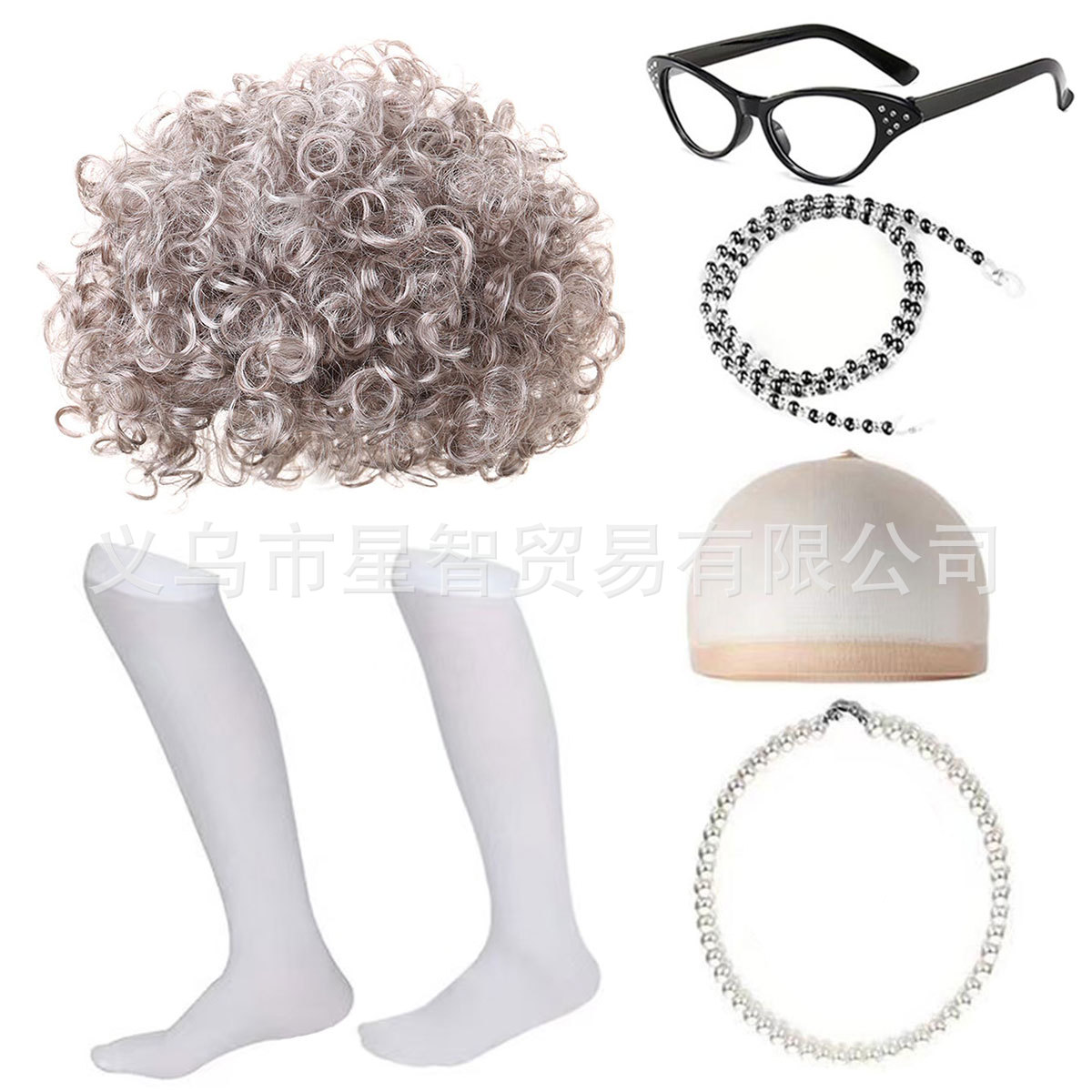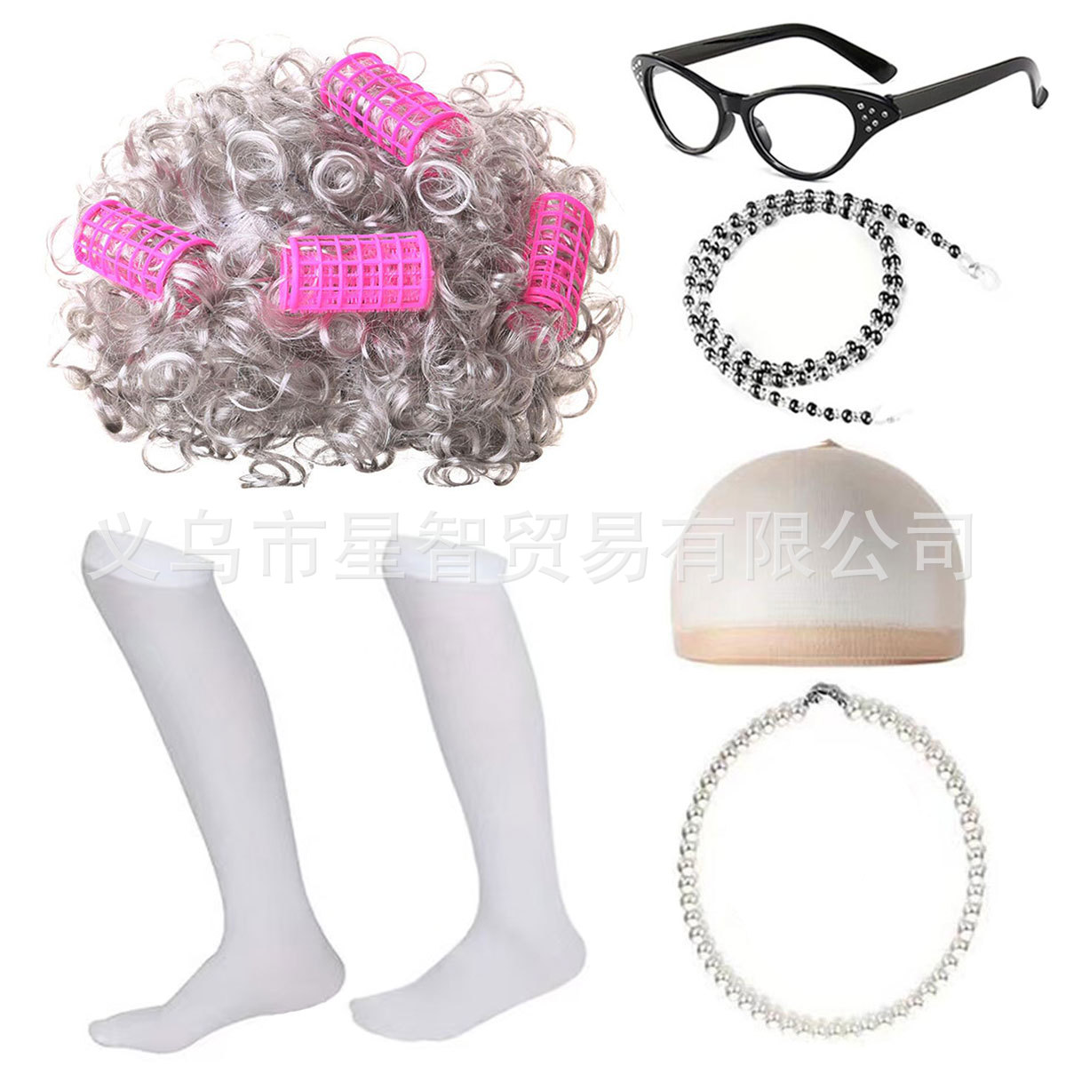 跨境老婆婆假发头套cos老年老奶奶假发装扮亚马逊老太婆假发套装