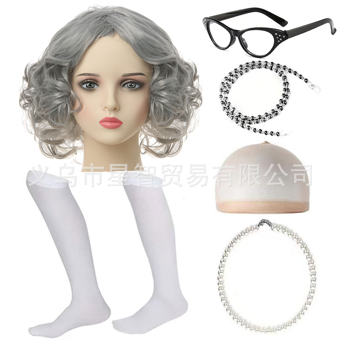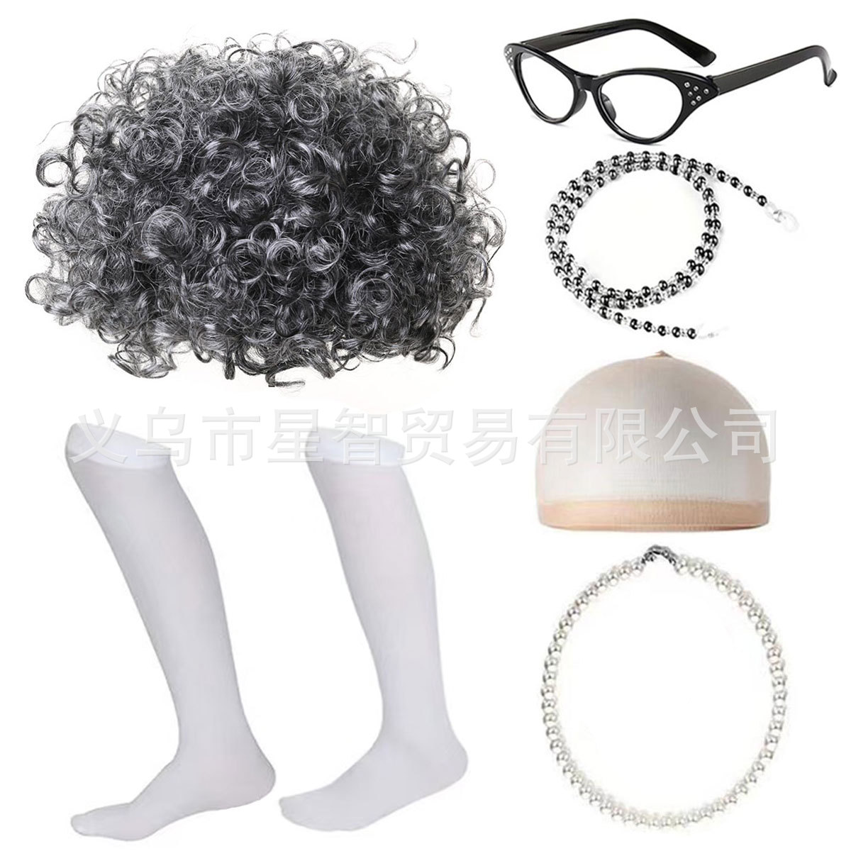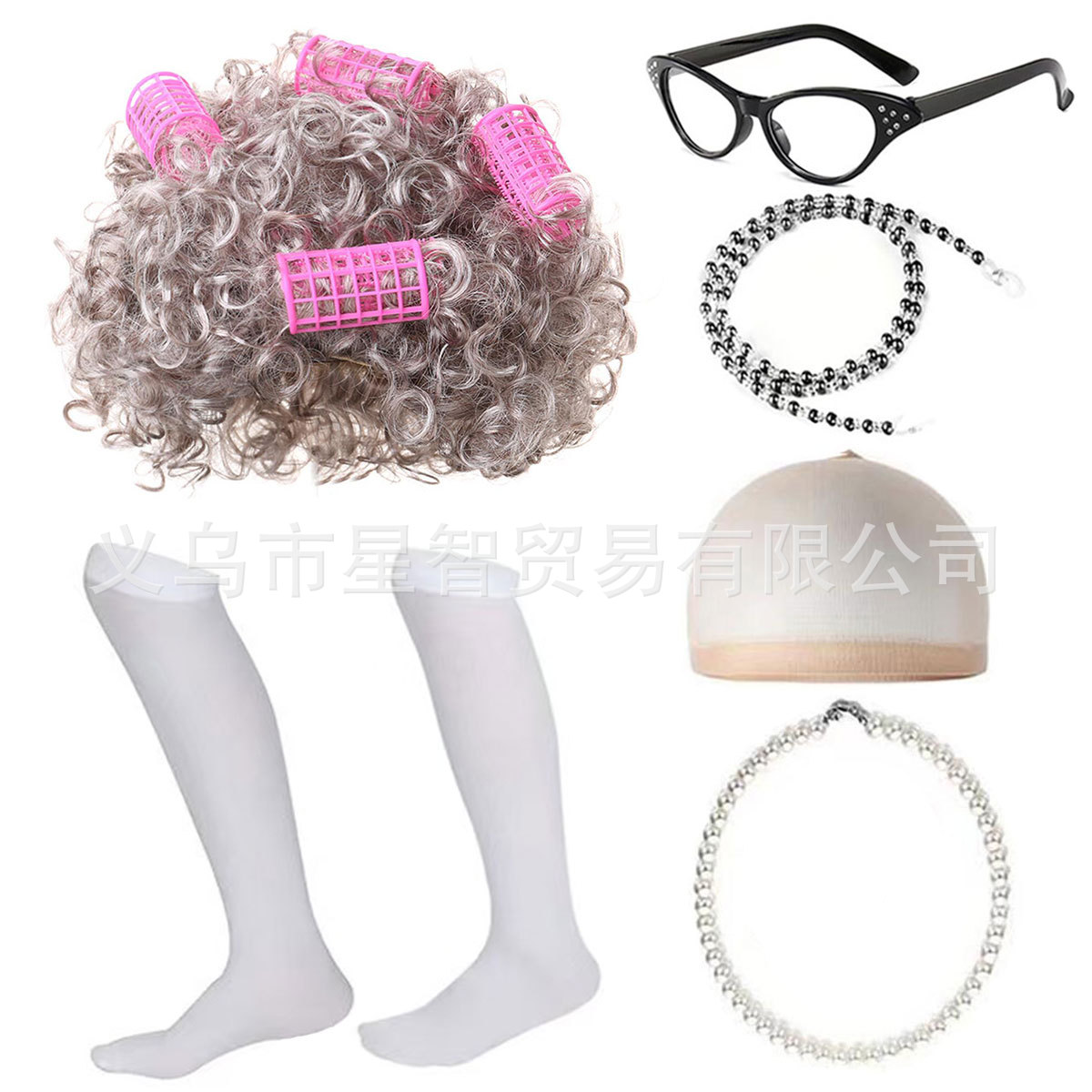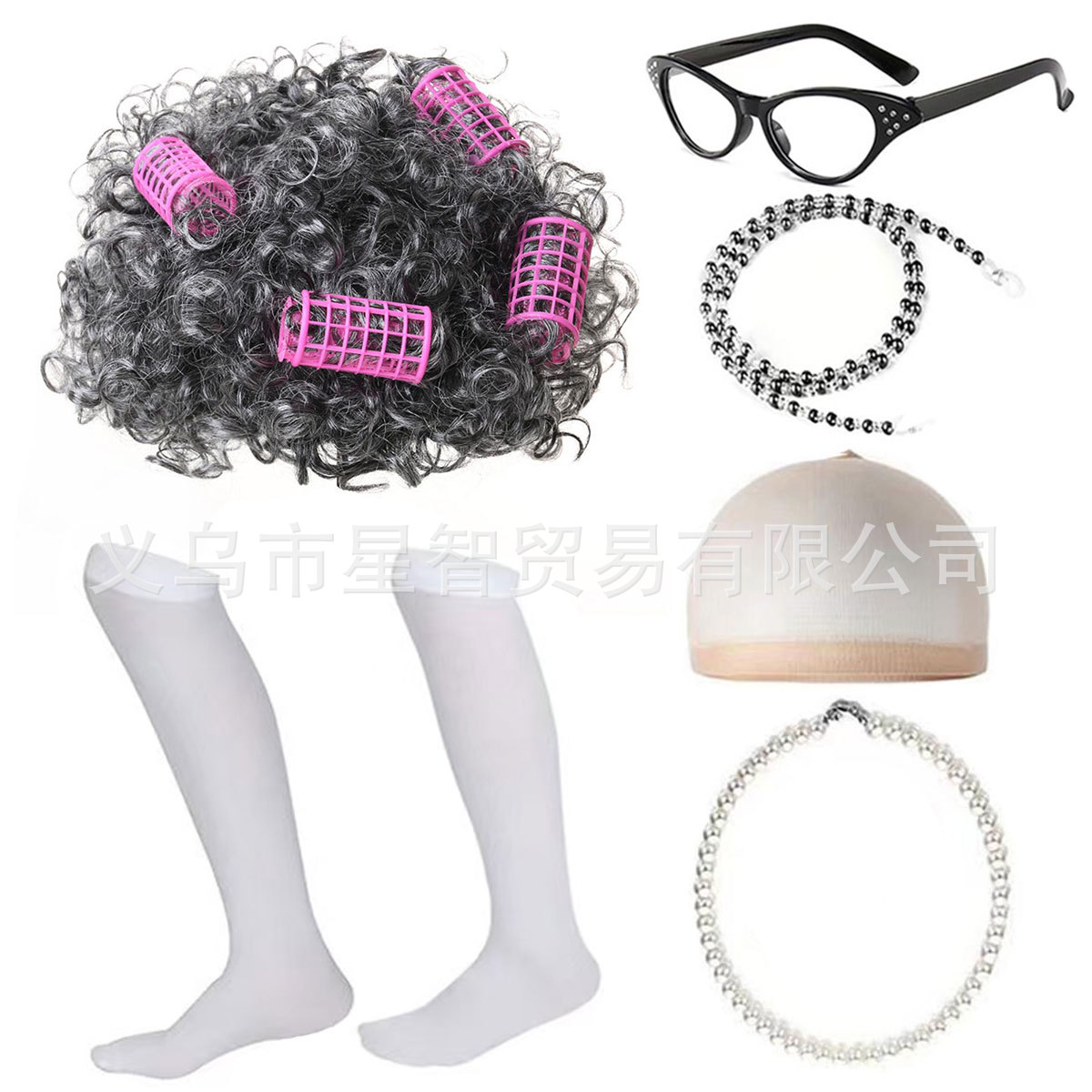 跨境老婆婆假发头套cos老年老奶奶假发装扮亚马逊老太婆假发套装