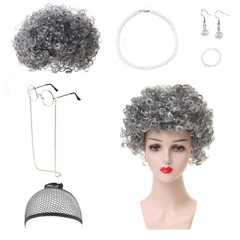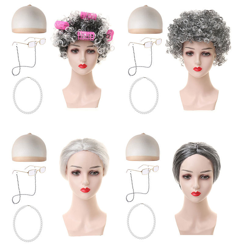 ハロウィン老人おじいさんかつらショートカールCOSおばあさんかつらお年寄りおばあちゃんショーかつらカバー
