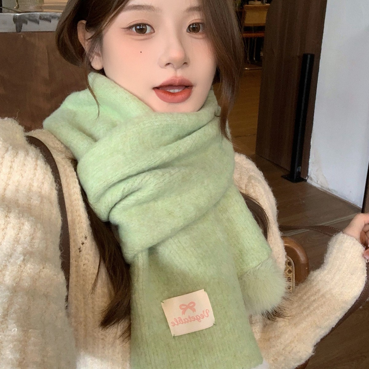 韩系绿色软糯毛球针织围巾女冬季氛围感加厚保暖防寒学生毛线围脖