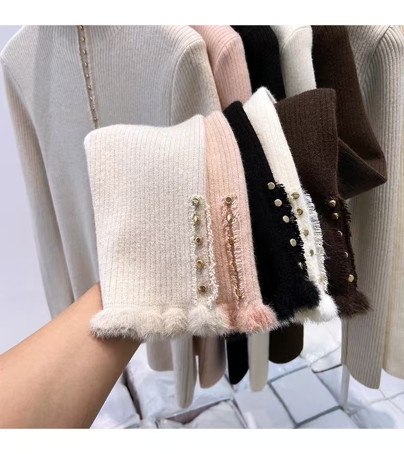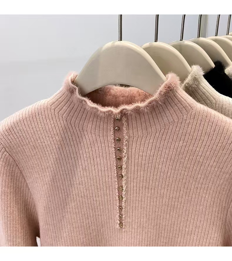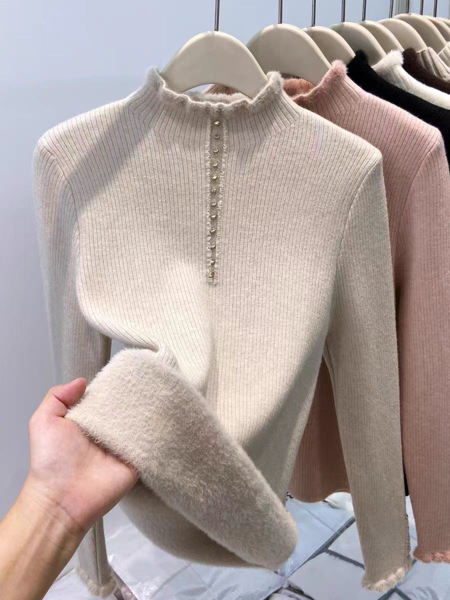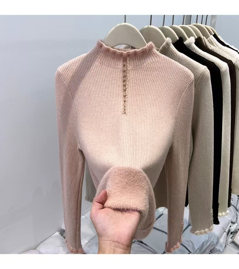加绒毛衣半高领打底衫女秋冬内搭木耳边加厚一体绒针织衫保暖上衣