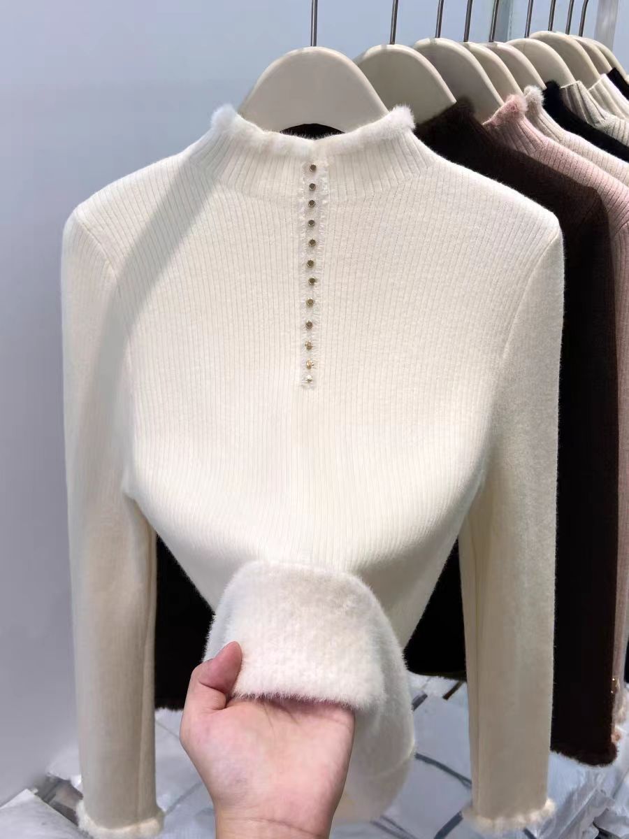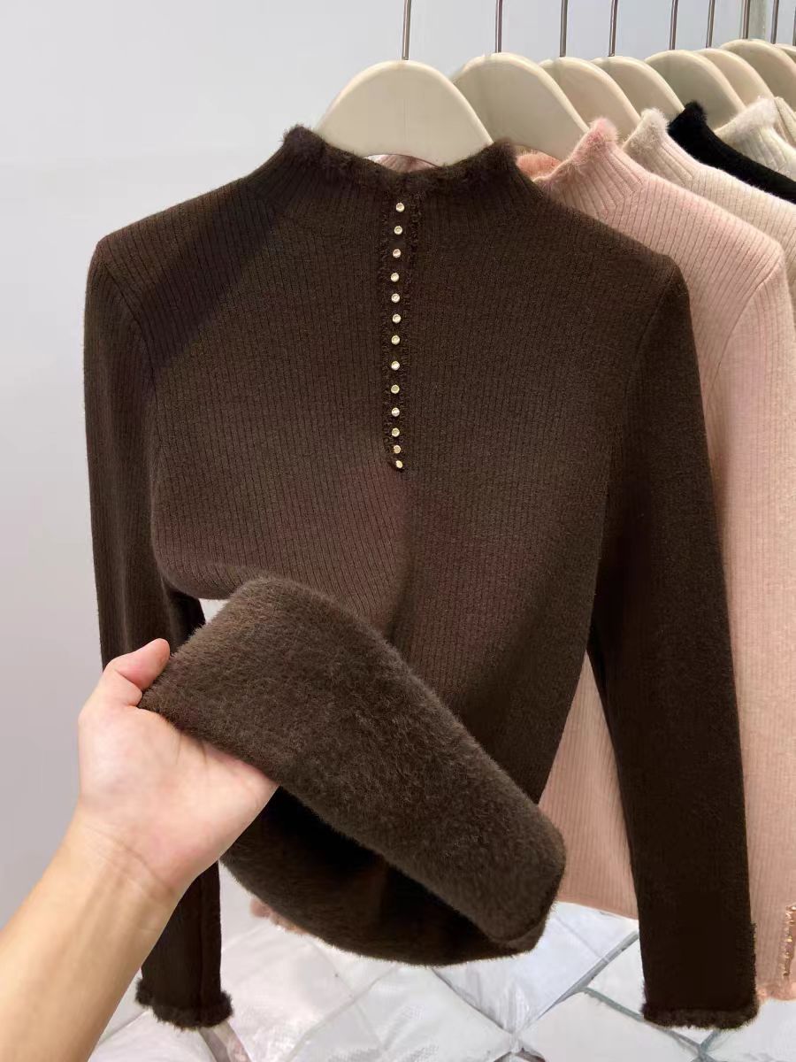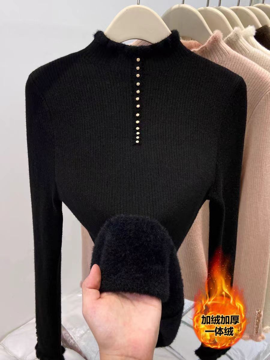 加绒毛衣女秋冬新款加厚一体绒内搭半开领拉链针织打底衫修身保暖