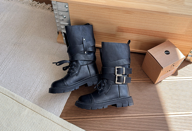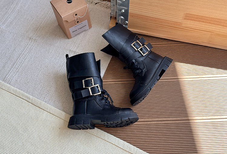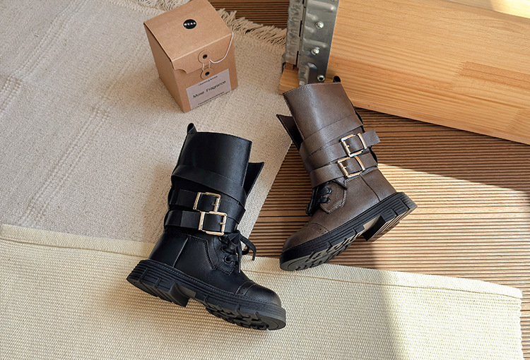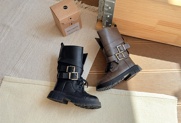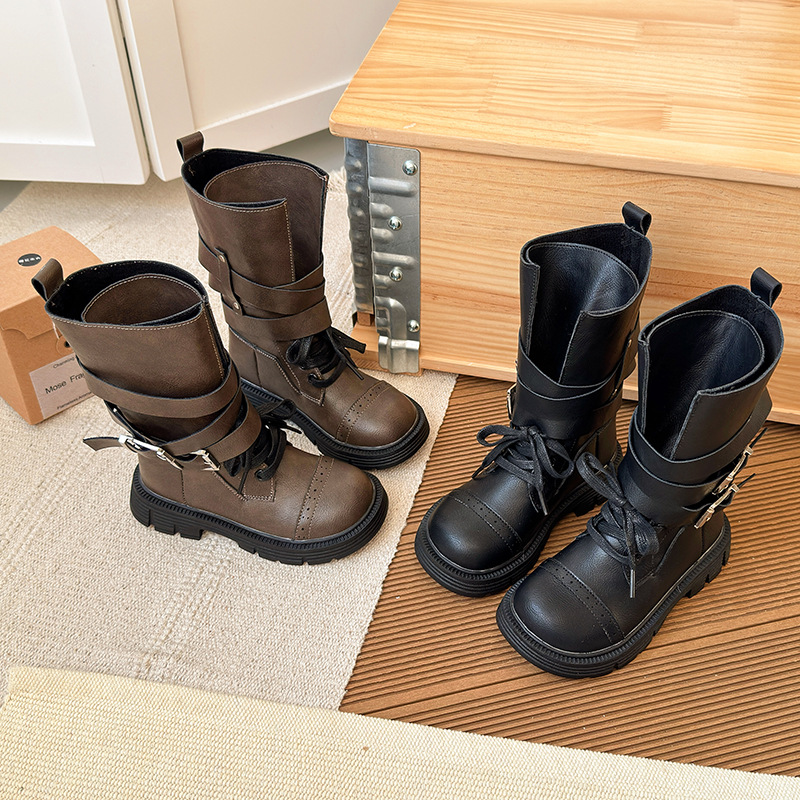 酷飒皮带扣英伦风马丁靴2025秋冬季新款韩版女童加绒中筒靴骑士靴