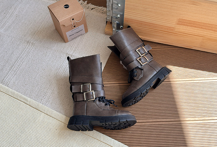 女童皮靴2025冬季新款复古双扣马丁靴韩版女孩时尚百搭防滑时装靴