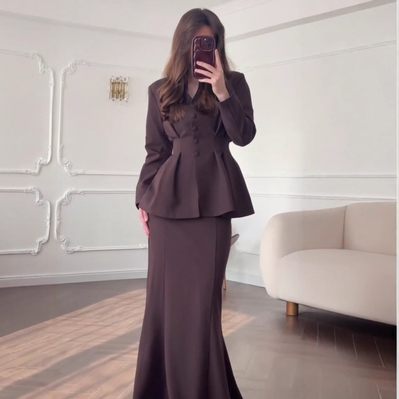 欧米の2025秋の新型は腰を収めてやせているボタンの長袖のコートの気質の魚の尾の包みの尻の長いスカートのスーツの婦人服を現します。