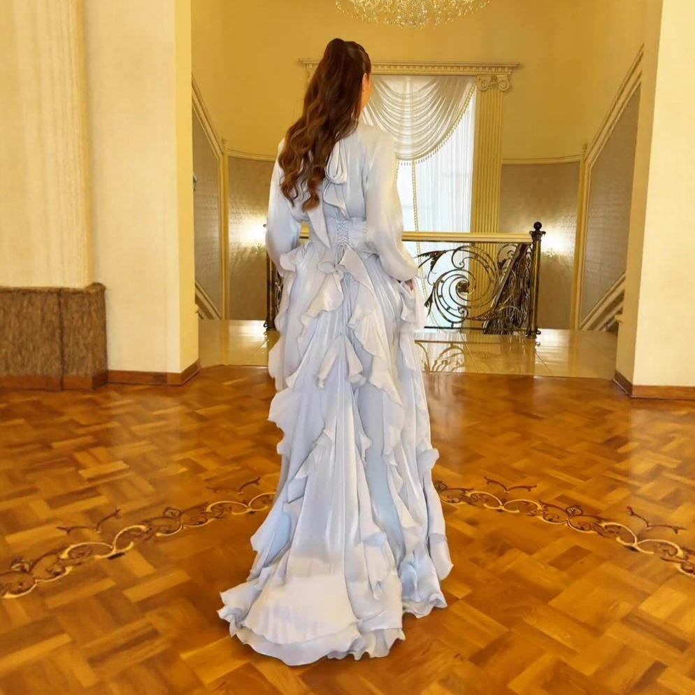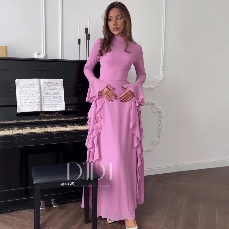 跨境欧美外贸女装2025秋季新款高领长袖荷叶边装饰收腰宴会连衣裙