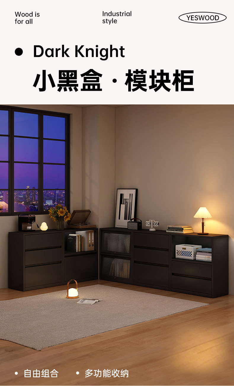 实木书柜高级黑色模块组合柜客厅沙发边柜隔断收纳柜储物矮柜书架