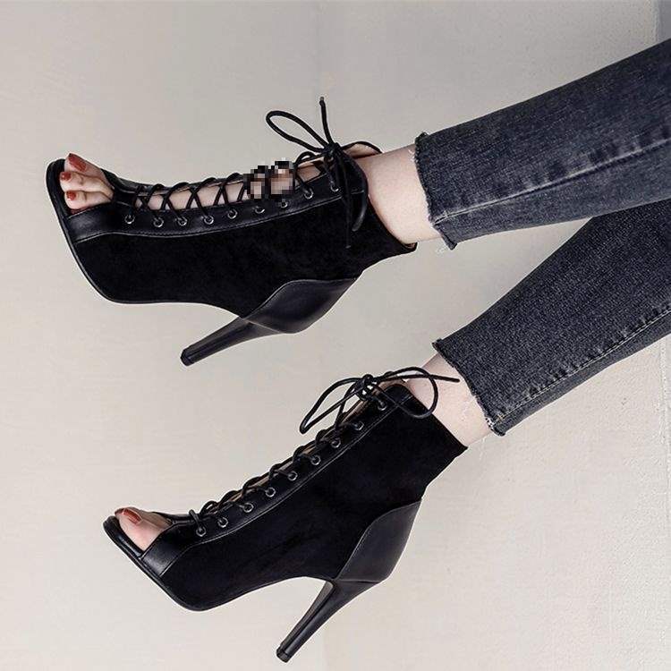 外贸鱼嘴凉靴夏季女系带细跟镂空短靴爵士舞蹈高跟鞋露趾凉鞋女