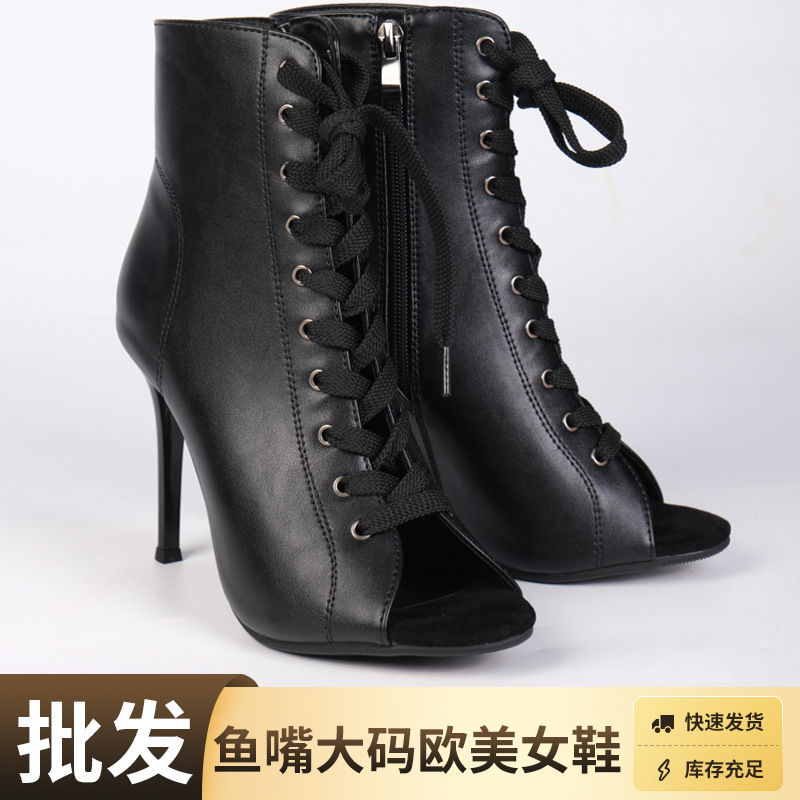 欧美细跟镂空短靴子系带爵士舞跳舞蹈高跟鞋大码凉鞋鱼嘴外贸凉靴