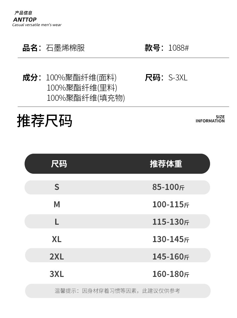 尺码 S(建议85-100斤),M(建议100-115斤),L(建议115-130斤),XL(建议130-145斤),2XL(建议145-160斤),3XL(建议160-180斤)