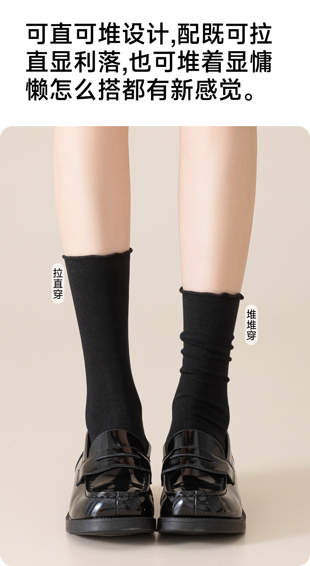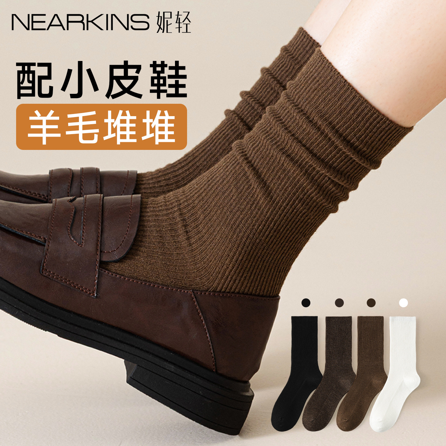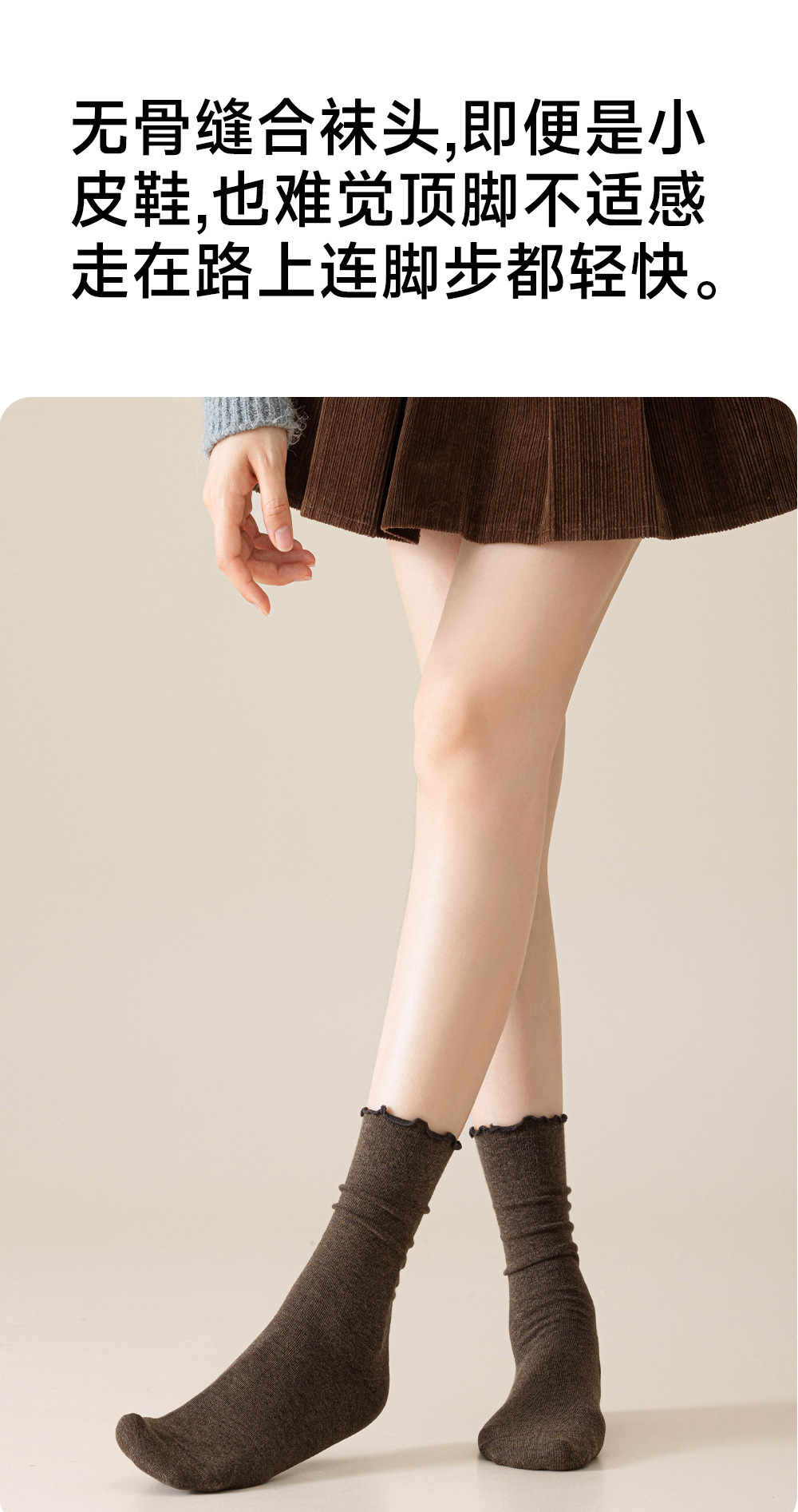 木耳边堆堆袜子女春秋季白色防臭中筒配小皮鞋乐福鞋咖色无骨长袜