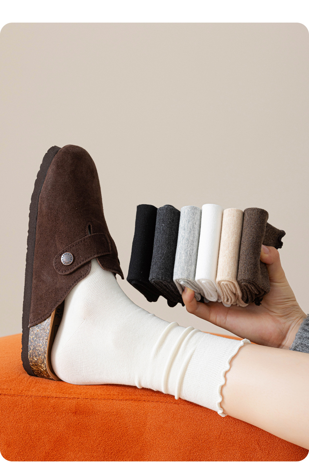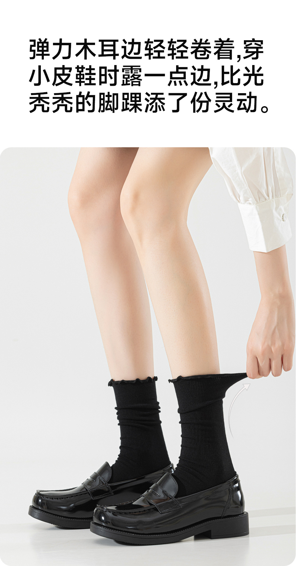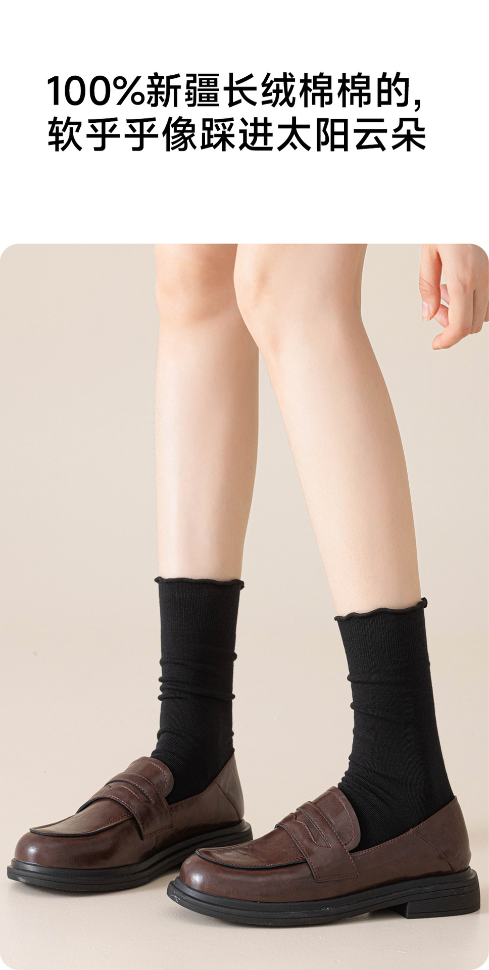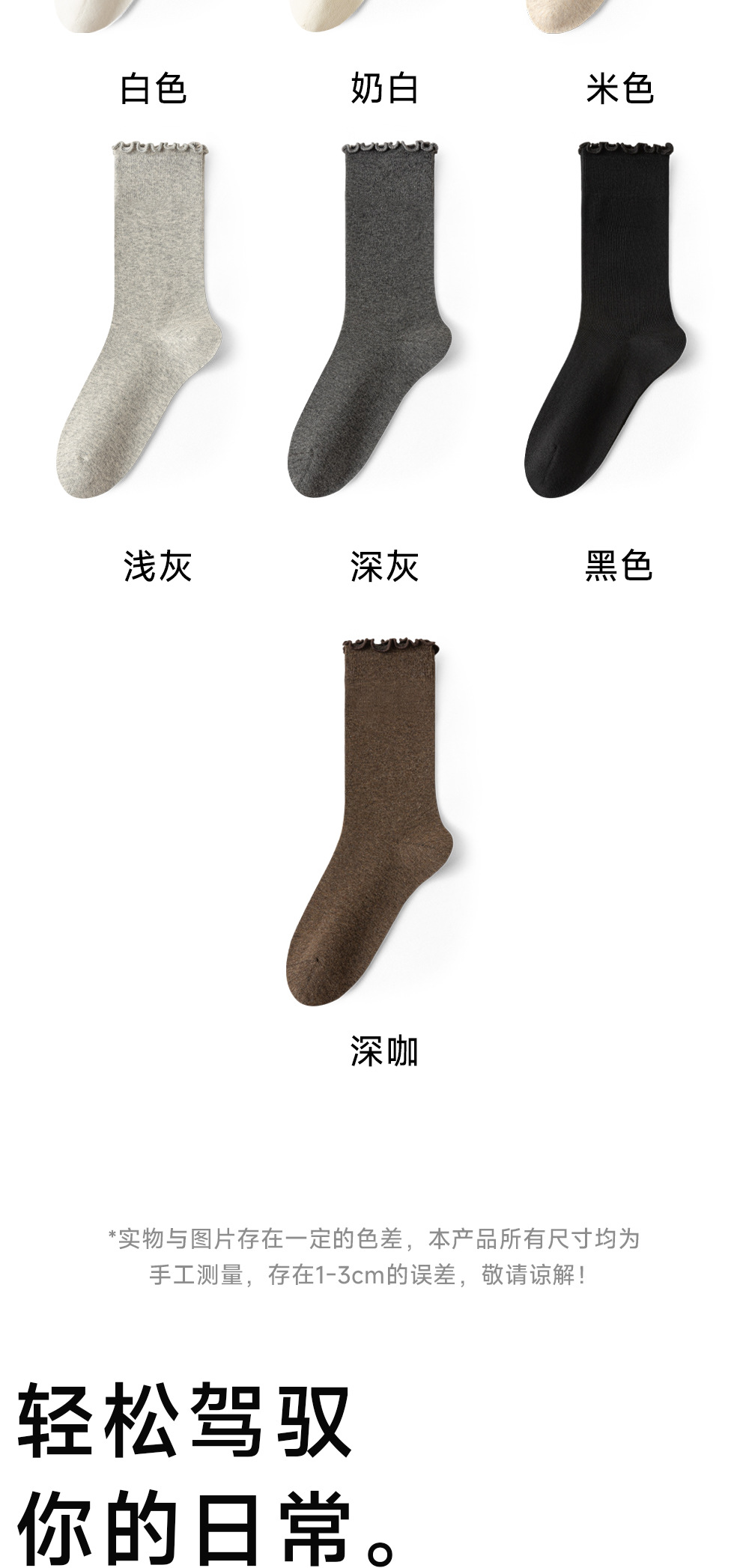木耳边堆堆袜子女春秋季白色防臭中筒配小皮鞋乐福鞋咖色无骨长袜