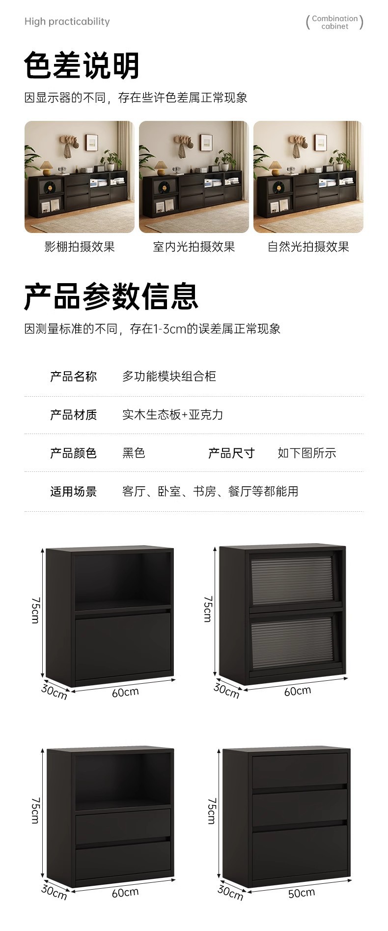 颜色 经典单抽款轻奢黑60*30*75CM,经典两抽款轻奢黑60*30*75CM,经典三抽款炭黑色50*30*75CM,亚克力门款炭黑色60*30*75CM