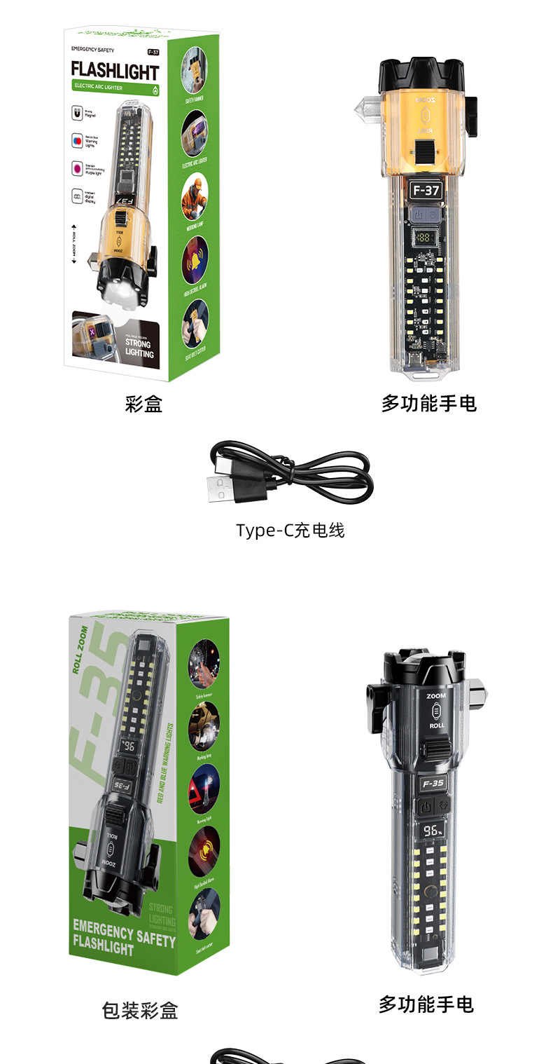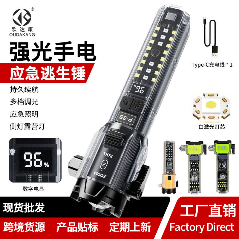 led手电筒强光爆亮长续航户外充电便携多功能安全锤应急cob工作灯