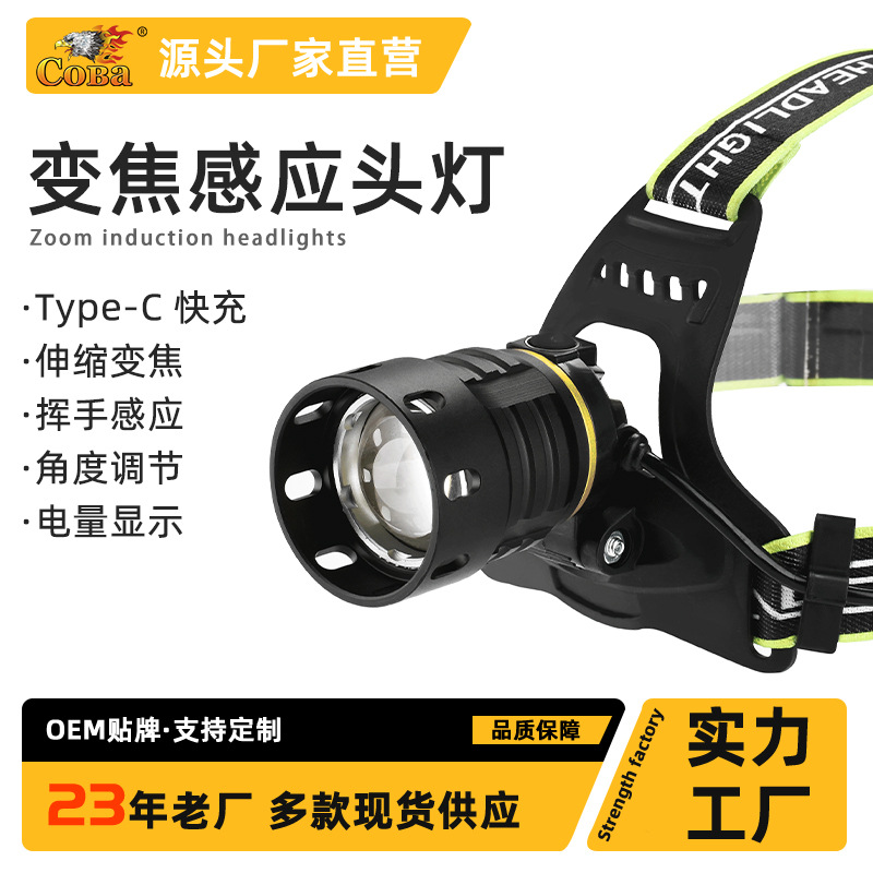 国境を越えた新型多機能誘導強光遠射ヘッドライトtype-c充電警告バックパックヘッドセット懐中電灯