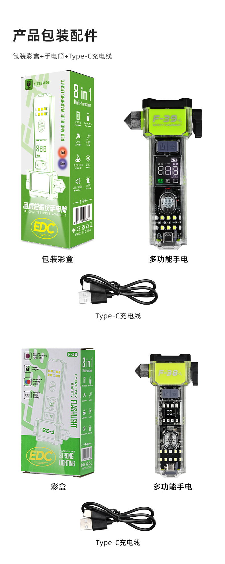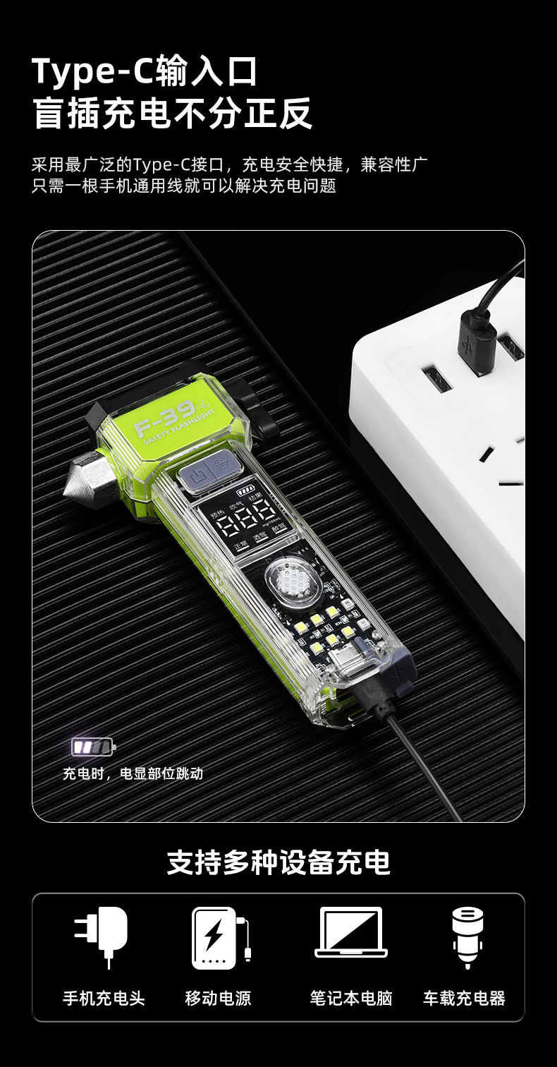 挂钩手电筒强光户外充电便携多功能安全锤应急割刀LED高亮工作灯