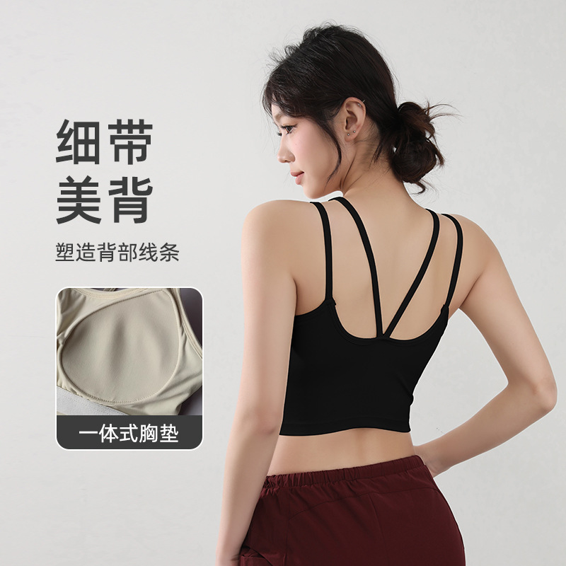 高强度防震聚拢型运动内衣一体式固定胸垫细肩带交叉美背健身文胸