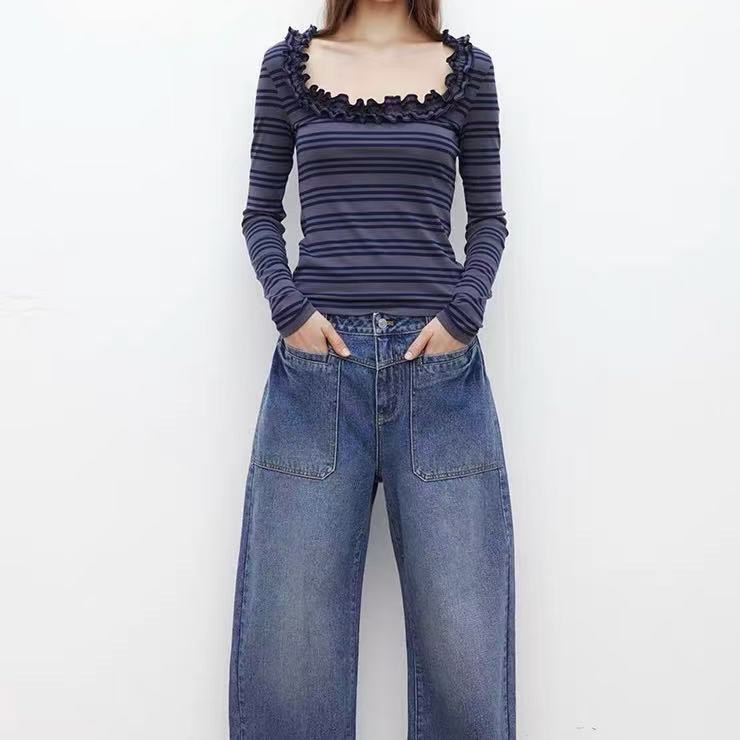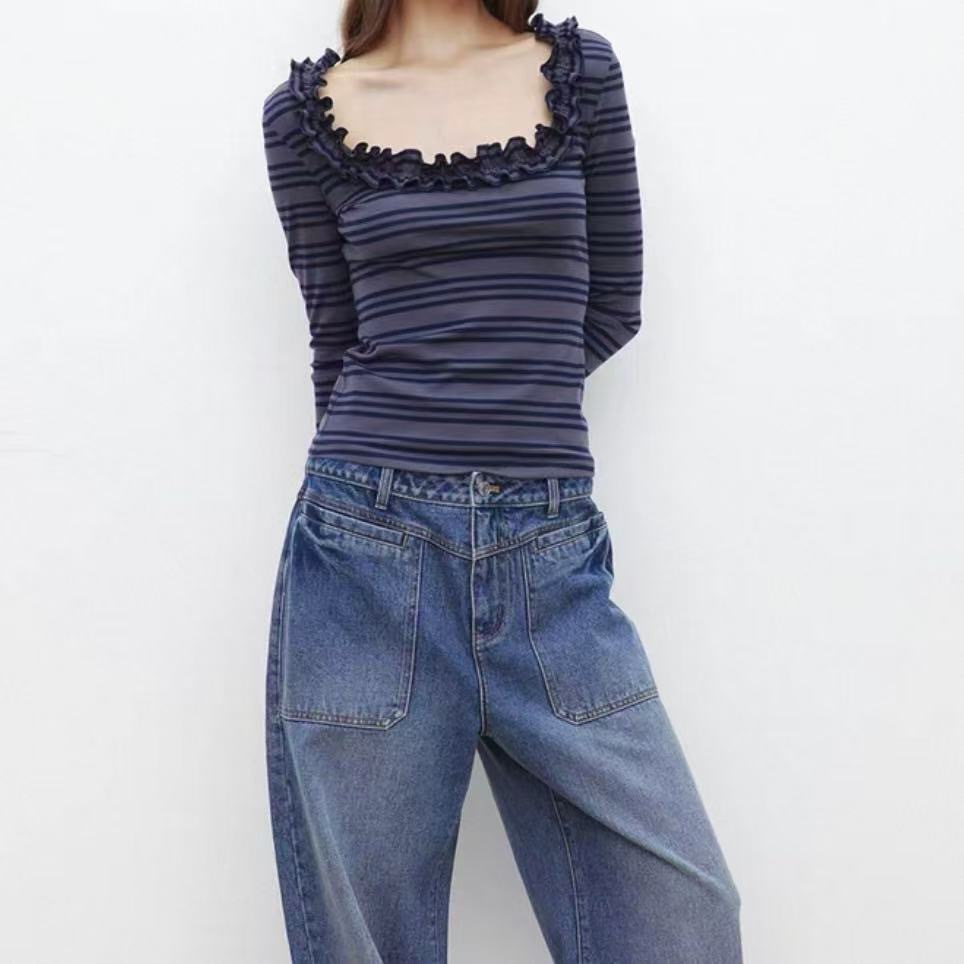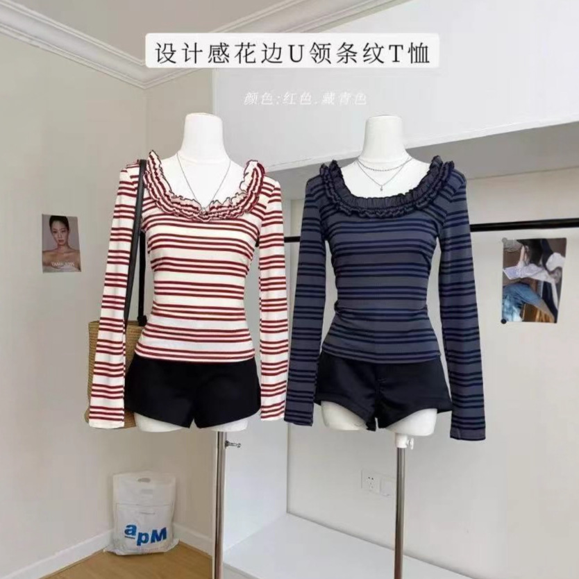 2025小众花边U领条纹T恤长袖针织衫上衣修身显瘦打底衫