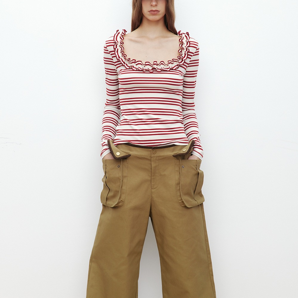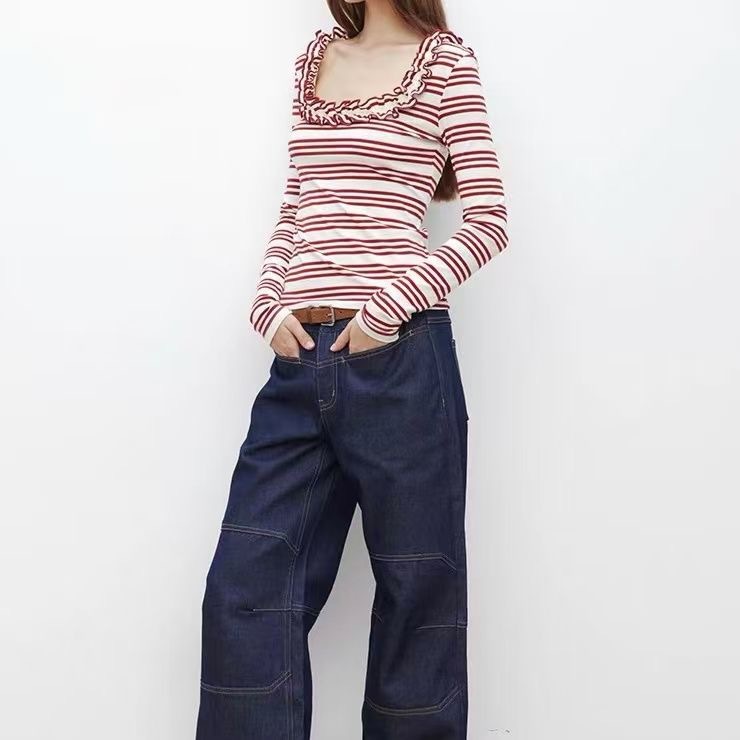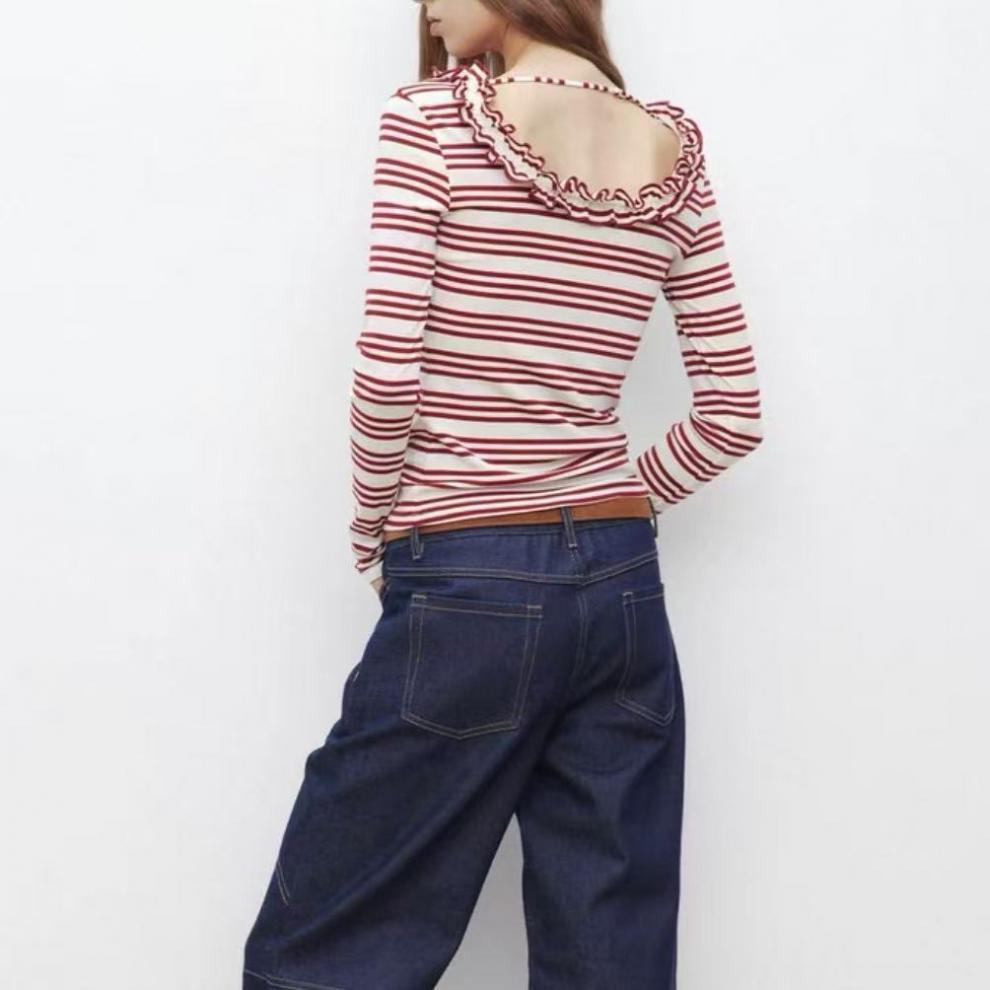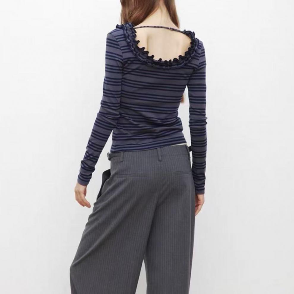 SHIYIYUE辣妹花边U领修身显瘦衣女秋季美式条纹外穿设计感长袖