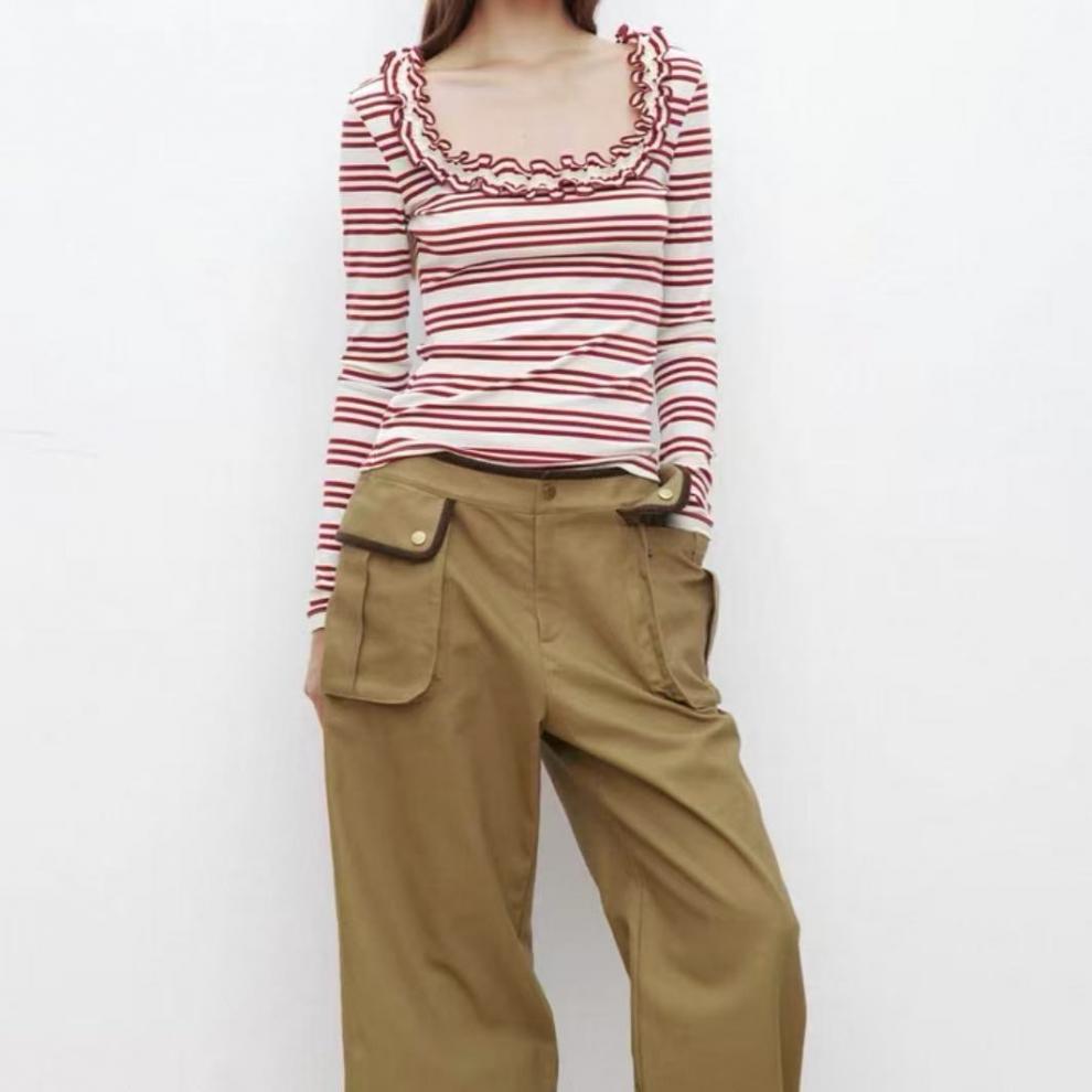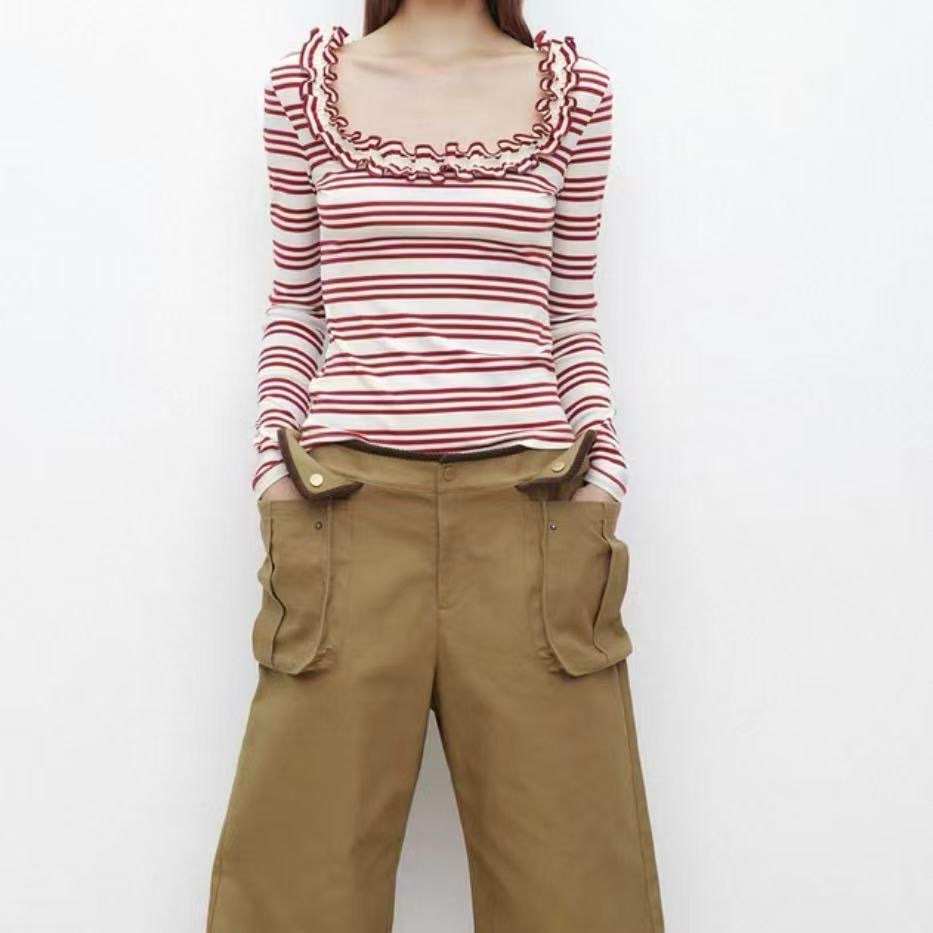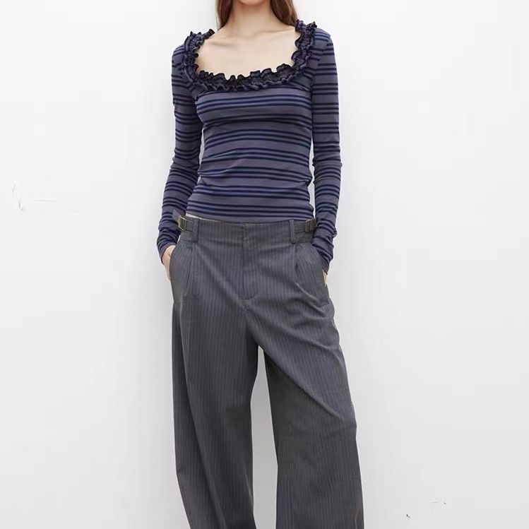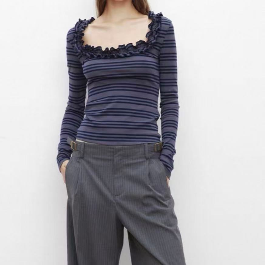 设计感小众花边U领条纹T恤长袖针织衫上衣修身打底衫