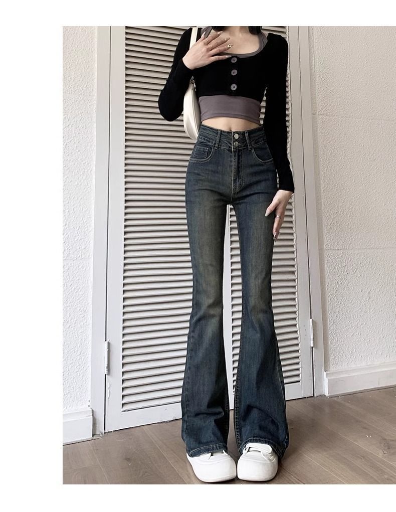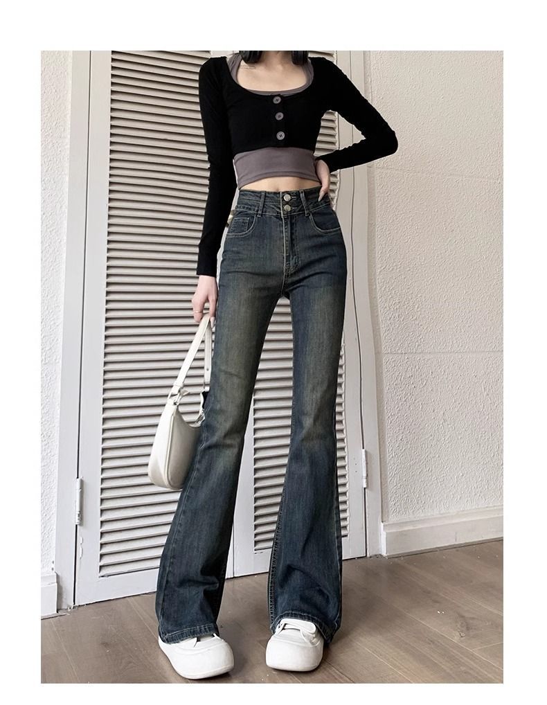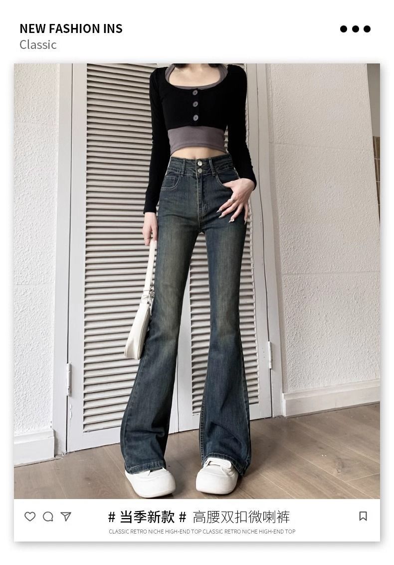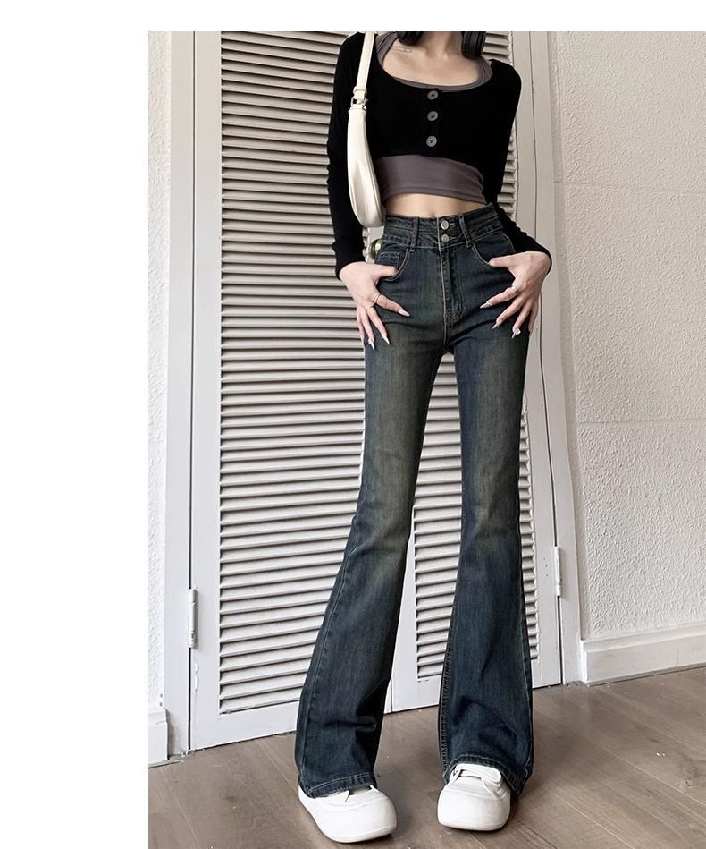 复古微喇叭牛仔裤女秋冬外穿加绒加厚小个子高腰显瘦马蹄拖地长裤