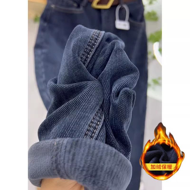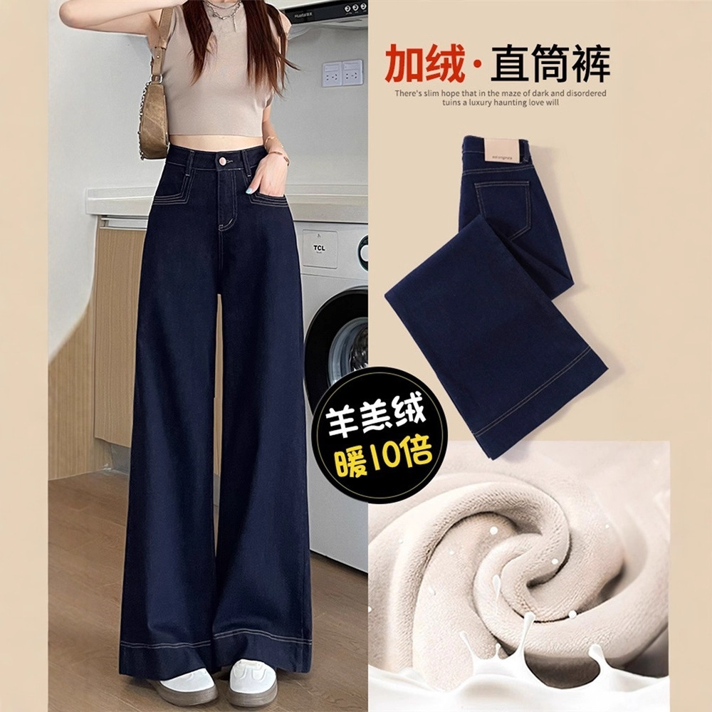 丹宁色加绒直筒牛仔裤女秋冬小个子高腰宽松遮胯加厚阔腿裤子