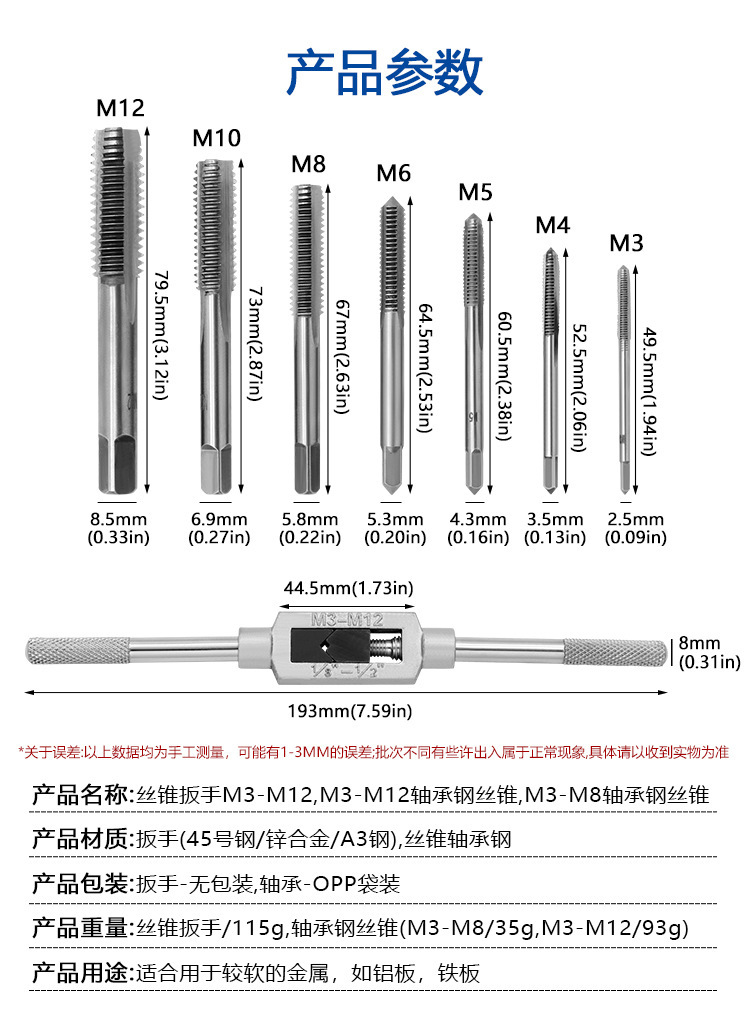 型号 M3-M12丝锥+扳手8件套224g,M3-M8丝锥+扳手6件套,M3-M12丝锥7支102g,M3-M8丝锥5支,M3-M6丝锥4支,3-12扳手122g