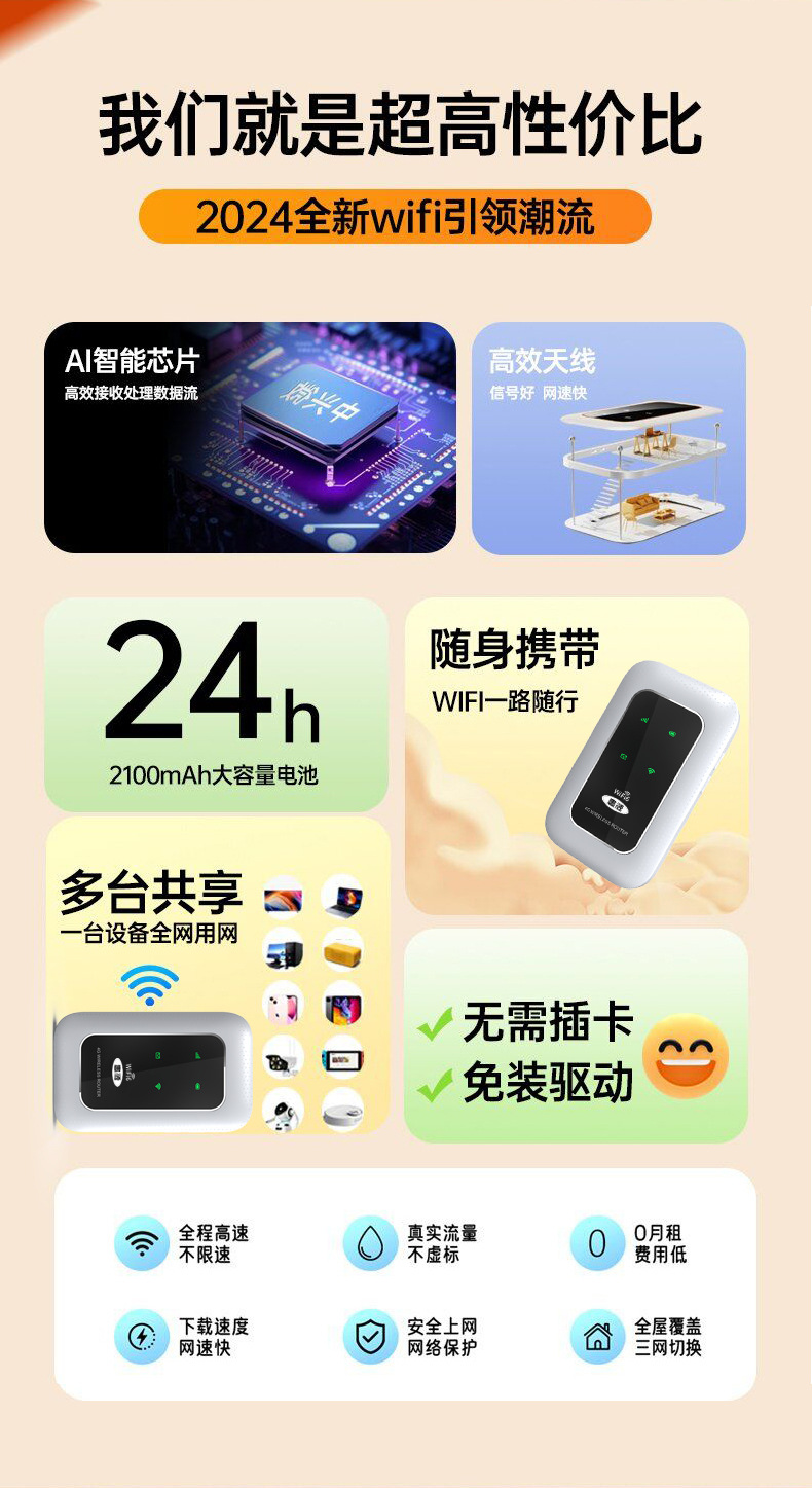 新款随身wifi无限流量4g无线移动网络免插卡家用车载宿舍租房